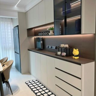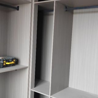 上海浦东新区惠南镇凤凰城木工施工中,柜体板材是兔宝宝ENF级杉木芯生态板,定制橡胶木门板,欢迎咨询
