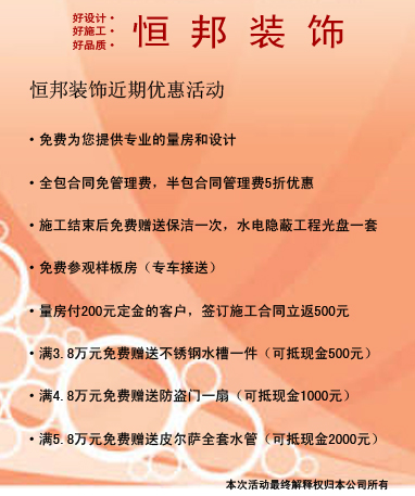 以设计为灵魂,把握每一寸布局,每一个尺寸,无论简约精巧还是沉稳大气,我们都坚持将无限的创意发挥到极至!以质量为根本,用挑剔的眼光审视细节,规范操作,严格管理,用精湛的技艺和高效的施工回报每一位恒邦消费者!