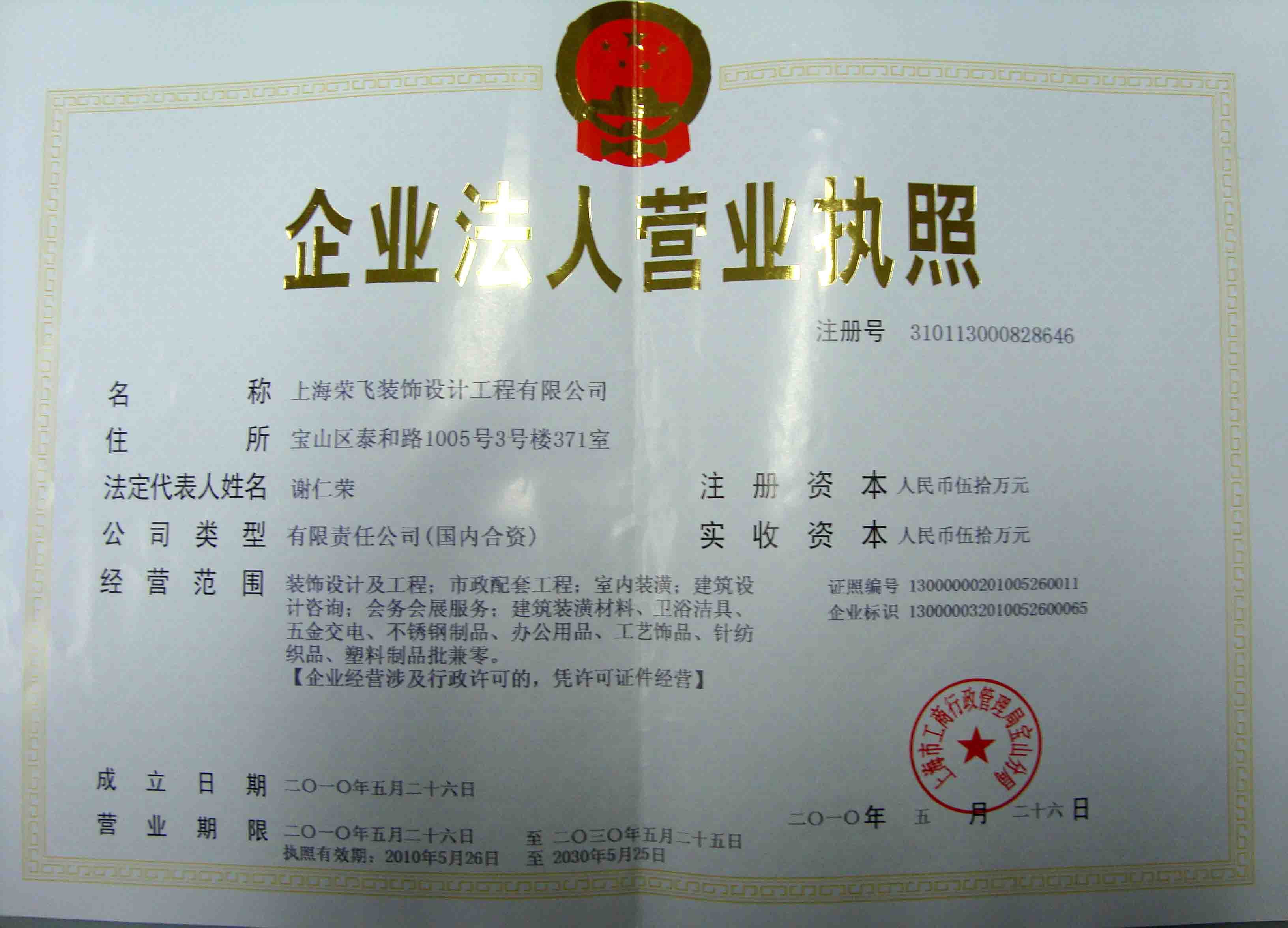上海荣飞装饰设计工程有限公司企业证书
