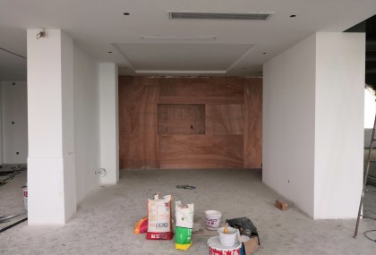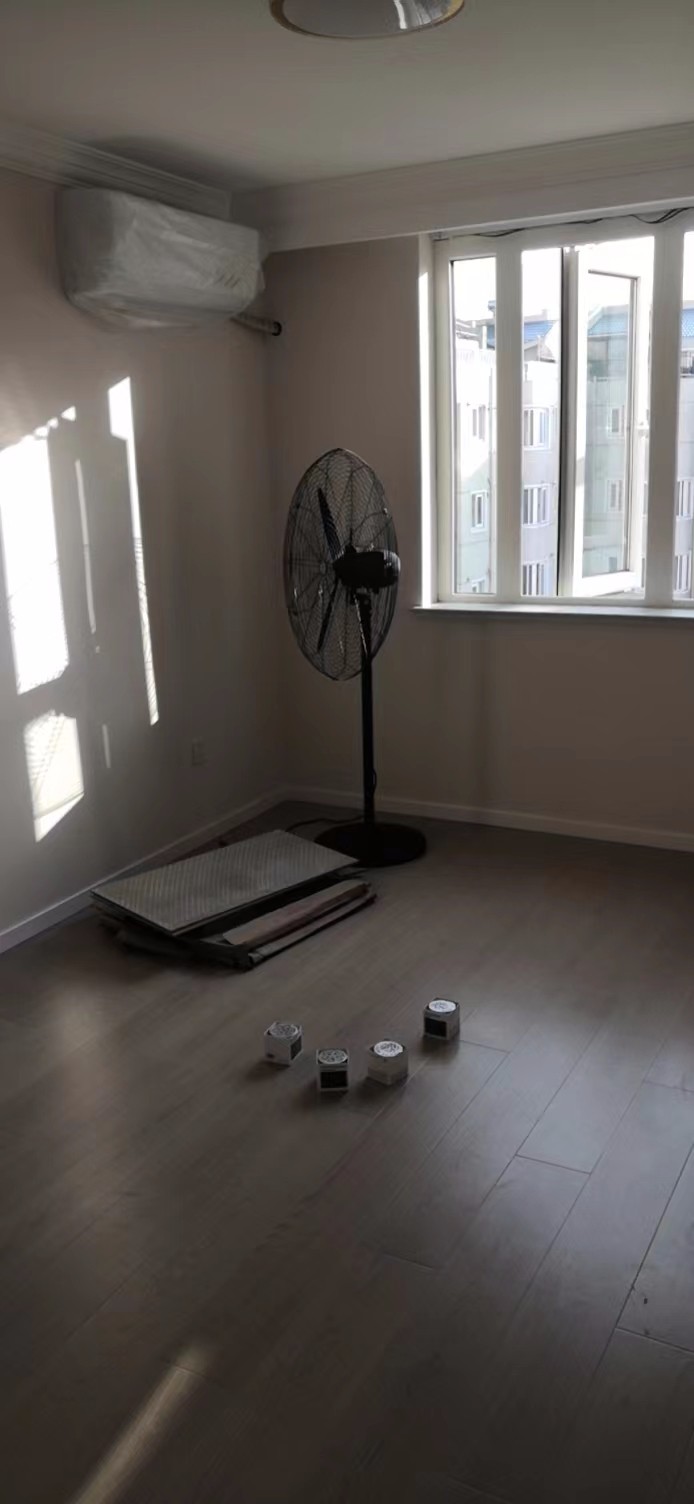 现阶段铺地板中,铺好地板刷背景墙涂料,等客户灯具到了后安装灯和插座。
