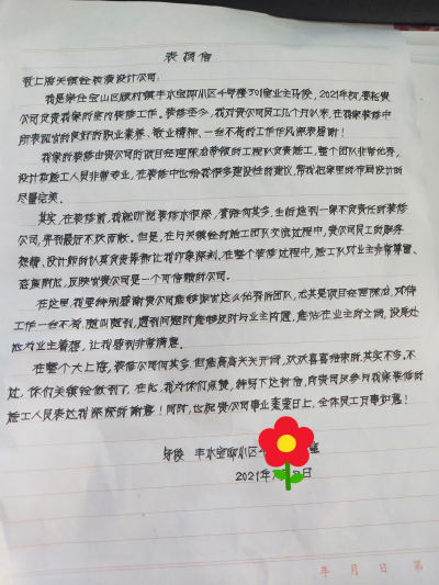 一次的客户,永远的朋友!2021年7月,关镇铨家居收到了一份特别的感谢信,来自上海丰水宝邸的业主马先生,年初在我们公司装修,现在不但成为了我们的客户,现在也从客户变成了朋友。感谢关镇铨家居的人员装修大半年以后,有任何问题都还可以随叫随到,积极解决。客户的每一次肯定和鼓励,都激励着我们关镇铨家居走好每