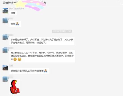 每一位客户,都是我们的VIP,每一位业主,都享受着1对n个人的尊贵服务。来自大康路1079弄的业主在装修期间,任何问题再装修业主群里面反映问题后,关镇铨家居客服监察中心1小时快速响应,4小时内部门责任人回复,48小时内出具解决方案并解决,解决后24小时候回访客户服务满意度,快速响应解决问题的服务给客
