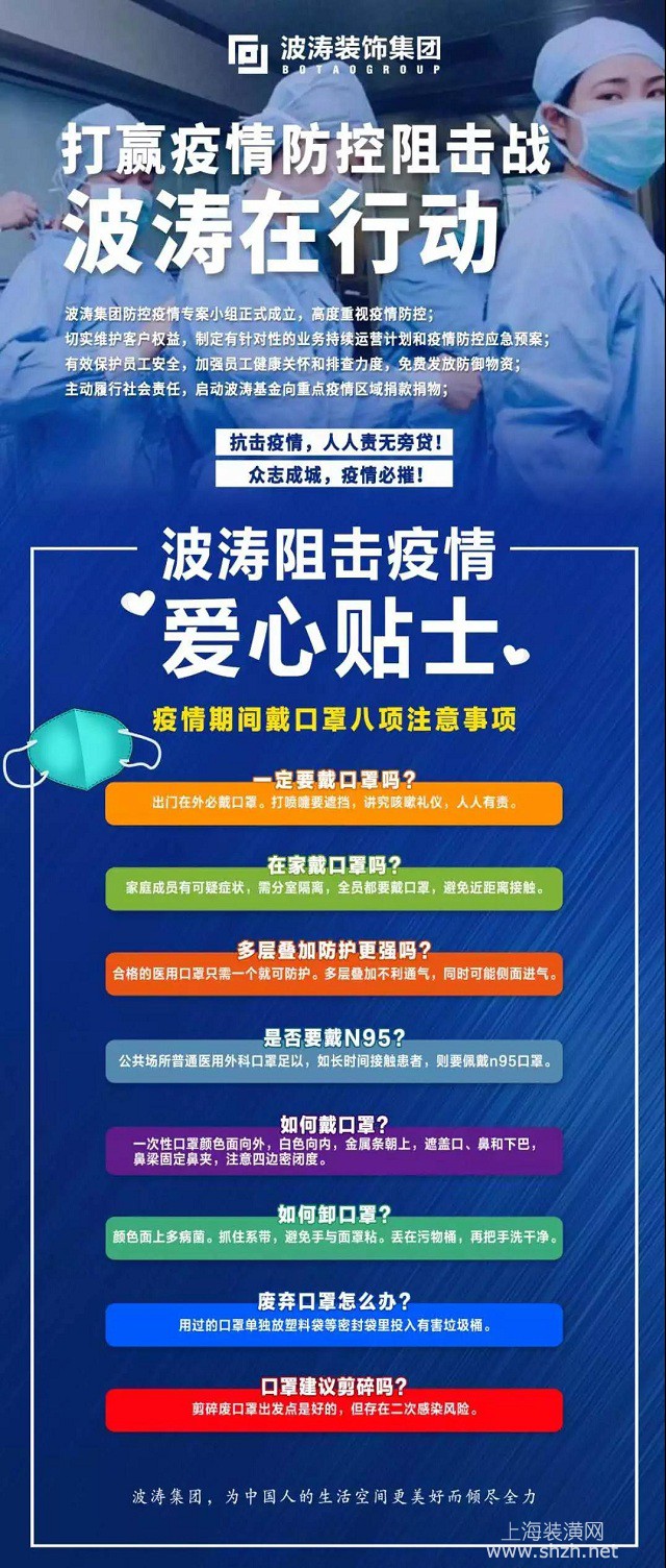 抗击疫情,波涛在行动波涛集团认真贯彻落实国家对新型冠状病毒感染的肺炎疫情的重要指示精神,扎实细致开展抗击疫情防控工作,秉承集团董事长谈治华先生在2020波涛发展规划中提出的两个中心原则,做到“以客户为中心,以员工为中心”,为阻击新型冠状病毒的疫情做出了多项积极措施,做一个有高度责任感的企业,为社会为国家贡献一己之力。一、成立波涛疫情防控专案小组2020 年 1 月 27 日,波涛集团积极响应党中央、国务院关于疫情防控的决策部署,疫情防控专案小组正式成立,构成以专案组组长、常务组长,执行组,宣传组,信息统计组,采购组,物资分配派发组和波涛基金组。全面部署抗击疫情防控工作;在人员管控,环境消毒,疫情宣传,物资筹备等方面,确保公司所有的疫情防护措施做到位。二、保护员工免费寄送防疫物资波涛为保障各位家人们在疫期的健康,全面做好预防工作,集团疫情防控专案小组调动一切力量,启动波涛爱心基金,通过多种渠道,采购了一些专业防护口罩,消毒水、84等防疫物资,向有需求的员工免费寄送,保卫大家的健康平安。三、用行动践行“以客户为中心波涛集团以“以客户为中心”绝非一句空话,在特殊时期波涛集团为他们制定防控措施,为客户发放防疫物资,减免管理费,为客户提供全方位的支持与帮助。1、取消国际家装节活动1月25日傍晚,就在 “第二十届国际家装文化节”开幕的前2天,波涛装饰集团决定取消原定于1月27日开幕的“第二十届国际家装文化节”及所有相关活动。对于所有民众而言,在公共场所、娱乐设施都纷纷关停的当下,这只不过是又一则最平常不过的活动取消通知。但对于此次活动的主办方“第二十届国际家装文化节”组委会及波涛装修集团而言,则是一个郑重且非常艰难的决定。这将意味着,集结了600多位在别墅大宅领域的资深设计师、200多家品牌合作伙伴,斥巨资改造的文化节场馆,前期在网络、媒体等各渠道投入的广告宣传等,以及所有员工3个多月的努力与付出都将付之东流。这一切对于正处于严冬的家装市场而言,无疑是严冬里的又一场暴风雪。波涛集团作为一家高度责任感的企业,在危急时刻把客户、员工的安全放在首位,做出牺牲,对社会、对客户、对员工的高度负责。2、减免全国超200家分公司管理费困难需要共同克服,波涛集团波澜管理考虑到困难时期全国各分公司面临的不能开业等情况,给全国超200家分公司进行了管理费减免,集团与分公司共同承担克服时艰。同时进行远程在线指导,对分公司人员规范防范疫情措施,给他们寄送防御物资,用实际行动切实帮助维护客户利益。3、做好全方位安全保障为了贯彻执行国家相关政策,保卫国家集体利益,波涛集团推迟到2 月 17 日复工,严格按照上海区域规定,进行返沪员工隔离措施。针对即将返岗复工,波涛集团采取了非常严密的预防措施:1)疫情信息及时调查统计:对进入到工作场所的人员组织做好登记、体温监测等工作对公司总部及各子公司分支机构员工动态及时调查统计。2)保障工作环境卫生安全:集团对公司总部及各子公司分支机构办公区域、营业场所、车辆的消毒防控切实采取通风、消毒、体温监测等必要措施保障办公营业场所卫生安全。3)严格及时排查:加大员工疫情排查力度,一旦发现采取隔离措施,杜绝在生活、办公期间的传染风险。四、积极宣传传递正能量波涛集团为增进各位员工对新型冠状病毒的重视和理解,提高员工的思想认识、 防范意识,引导干部职工做到不信谣、不传谣、不造谣,并提高员工良好卫生习惯, 集团结合国家、相关医疗机构和集团下发的各类文件,及时响应并普 及以下防控知识文件●波涛集团抗疫情期间工作纪律●波涛集团抗疫情期间工作场所自我防护●波涛阻击疫情爱心贴士系列科普海报●《抗击新型冠状病毒肺炎波涛集团员工必读必行手册》● 返程返岗防护要点《波涛人倡议书》等并通过微信公众号、集团 QQ 群,朋友圈等网络媒介,及时传达正确措施。当前疫情防控形势依然十分严峻,但我们坚信,在党中央、国务院的坚强领导下,全国人民、社会各界定能同舟共济,众志成城,共同打赢这场疫情阻击战。
