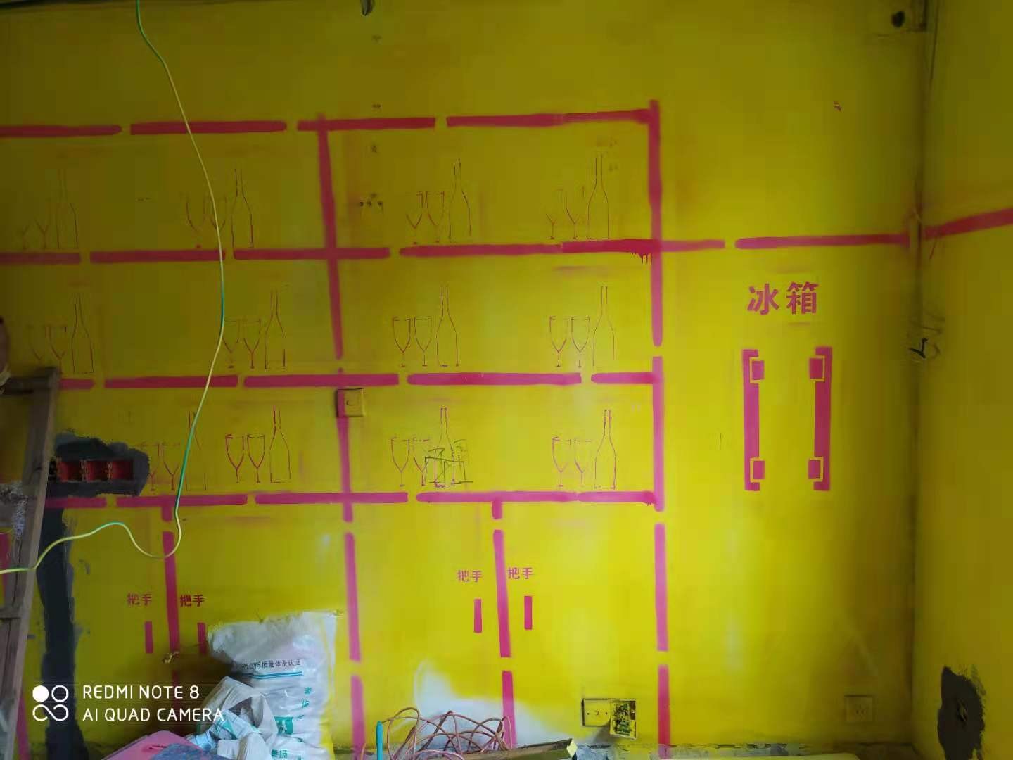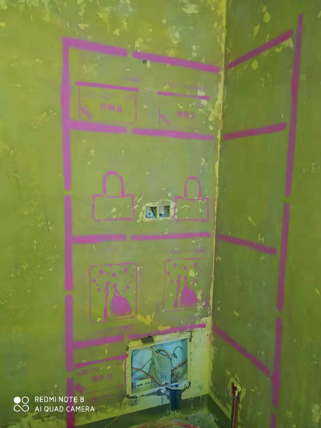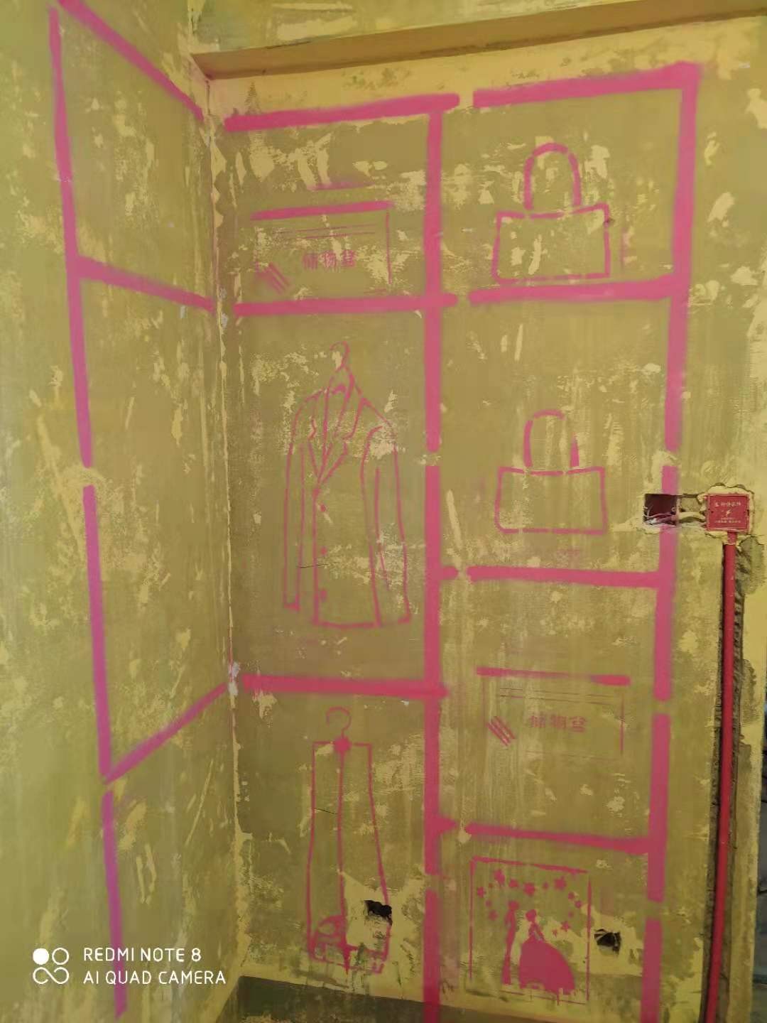 这是全景放样,我们根据图纸把衣柜、床、茶几、电视柜等家具1:1 呈现在毛坯房上,有了初样,业主对家的布局就有数了,同时也时刻提醒工人做好开关、插座等位置的相关预留工作。