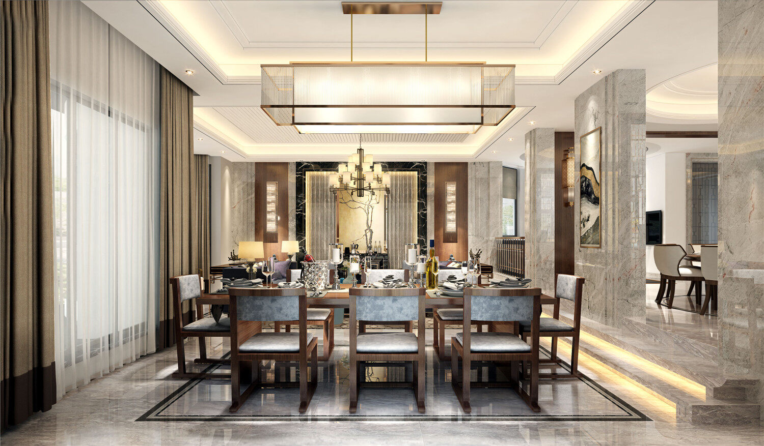 6一层餐厅世茂湖滨花园别墅装修 - 世茂湖滨花园别墅装修新中式风格设计方案展示,上海腾龙别墅设计师任云龙作品,欢迎品鉴