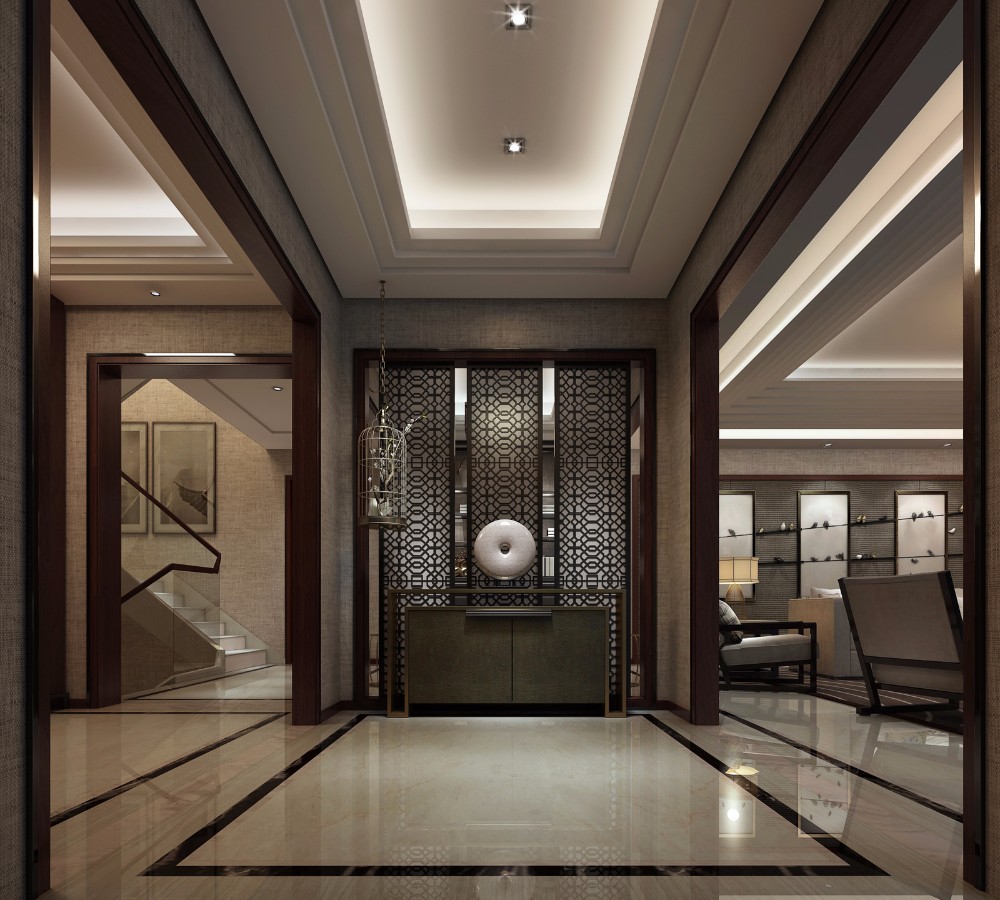 空间结构上借用了中式传统造园手法,运用几何式图案进行空间划分,装饰上以中轴线,对称的手法表现,在原有结构上重新规划,客厅与餐厅的过厅区域规划成传统的“四方亭”格局,结合功能性创造出别具一格的境地,布局上动静分区合理,形成独立的品茶会客,休闲娱乐,起居饮食的高品质生活区域,满足居住者的功能需求。