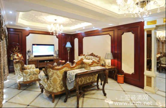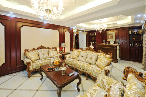 繁华世界的欧式风格,打造古典与自然结合的设计客厅.png - 墙面采用深色实木装饰,整体统一。浅色调的吊顶与地面点亮空间的清新气息。水晶灯灿烂的灯光、绚烂夺目的光泽将整个环境照亮,洒下一片光彩。简洁搭配一套沙发组合与家具,一目了然的格局却因软装的丰富欧式图案、精致的细节刻画,显得精彩夺目。