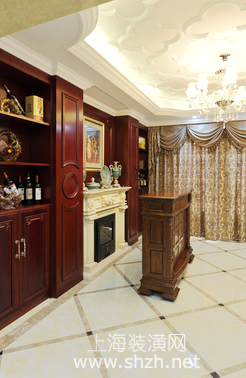 繁华世界的欧式风格,打造古典与自然结合的设计.png - 仿欧式复古的壁炉,装饰于酒柜中央;摆放一套水蓝色器具,清雅精致。同时一幅欧式场景油画增添了一抹艺术气息。两边的酒柜靠墙设计,上部分展示着红葡萄酒与装饰品,下部分则起到收纳的作用,起到一定的隐秘性。而处于前方的一款高柜,则达到酒桌的作用。