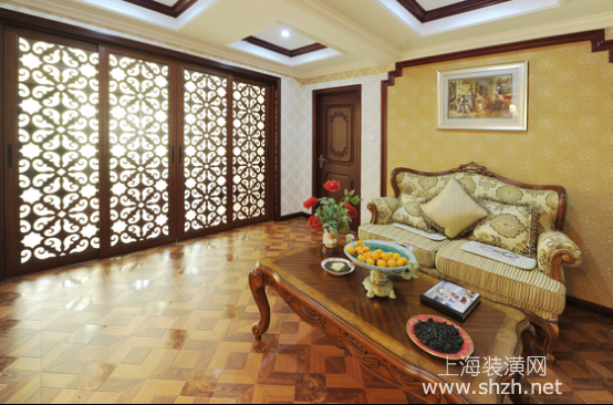 繁华世界的欧式风格,打造古典与自然结合的设计客厅2.png - 柔软的沙发饱满而舒适,搭配雕花的茶几,形成一处慵懒舒适的休憩环境。菱格的木质地面压重空间色彩,而沙发背景墙面的金色过渡了地面的重色与吊顶的浅色,使其更融洽。花型镂空的移门在外部光线的照射下,泛着明亮温馨的效果。