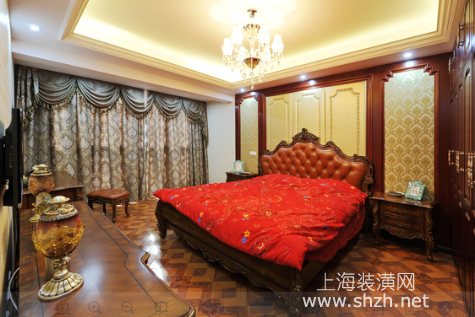 繁华世界的欧式风格,打造古典与自然结合的设计卧室.png - 吊顶采用简洁的四边形与抬高吊顶的形式打造宽敞的卧室环境。皮质床头软包的浅色为背景,突出床具的棕红色皮质,在水晶灯灯光下泛着黝亮的质感。大红色床品的选择为整个空间渲染上一层喜色,呈现温馨浪漫的氛围。