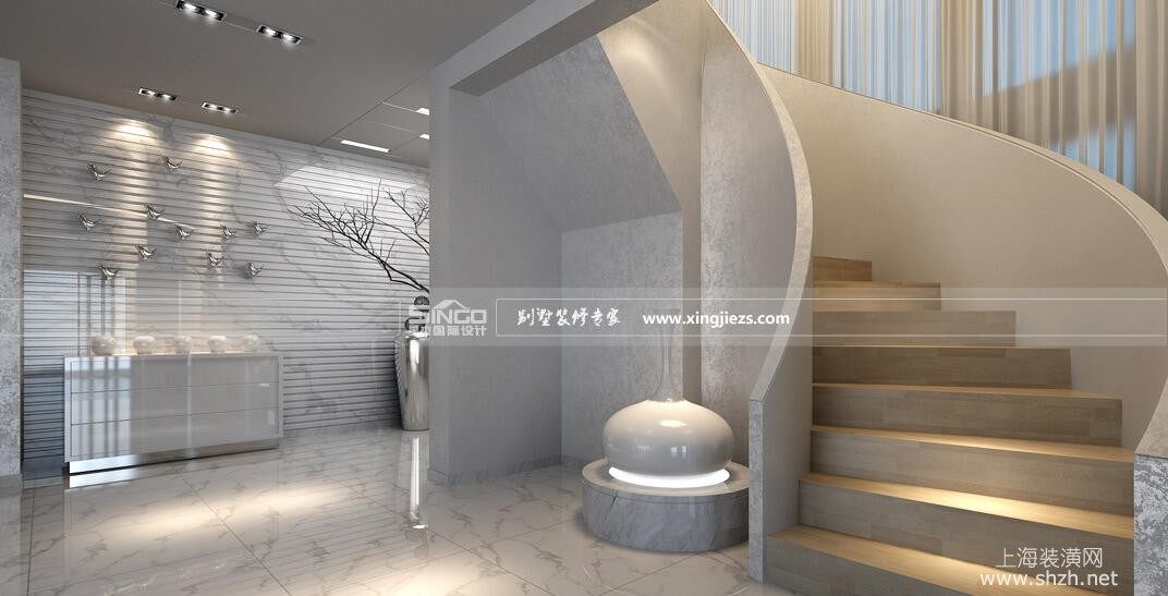 玄关旋转楼梯效果图 - 本套方案设计感最特别的就是这个旋转楼梯,独特的设计线条即做到了柔美感,又不是大气。