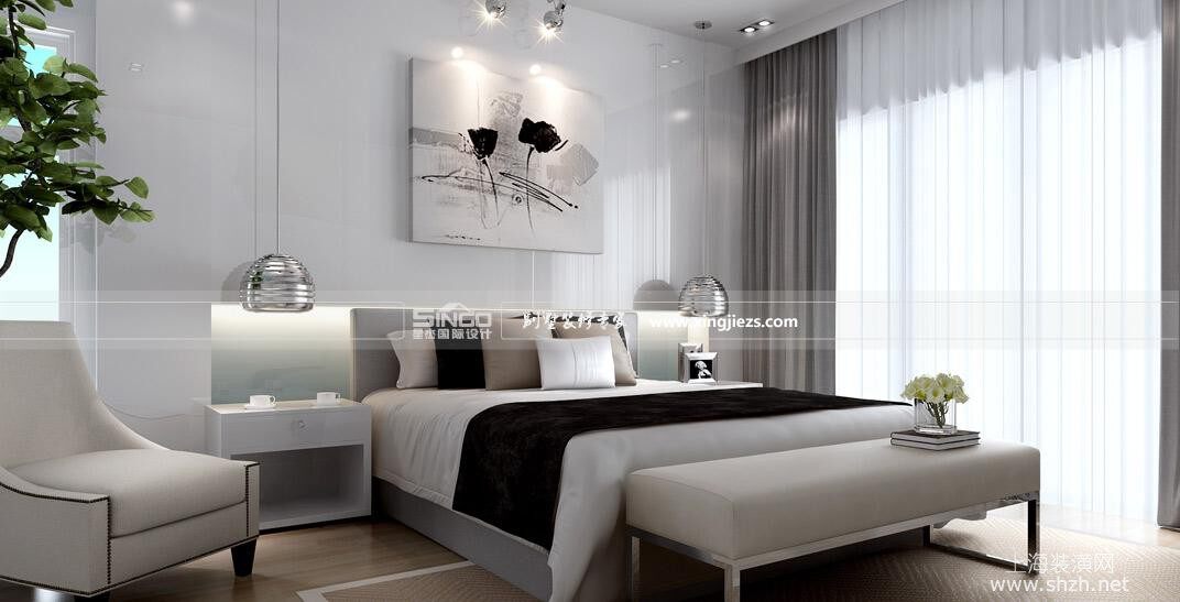 主卧效果图 - 主卧以白色为基调,黑色复调大玻璃落地窗以灰色协调更显舒心安逸。