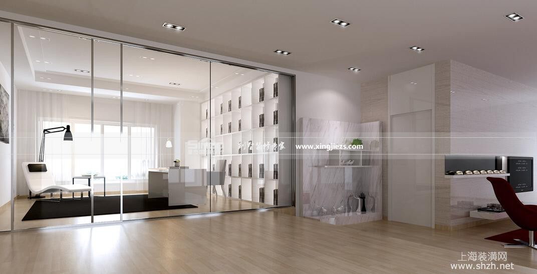 400平简约书房效果图 - 大面积落地玻璃窗作为与客厅的隔墙显得空间宽敞明亮。