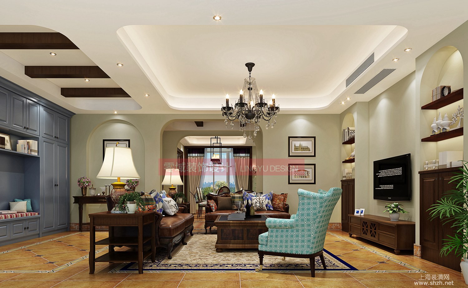 3_副本.jpg - 客厅整体色调比较温馨,美式复古风格主要体现在家具的色调、造型有较重的历史感, 硬装上仿古地砖、吊顶木梁也是追求仿古工艺,怀旧、浪漫,尊重时间。 总体而言,客厅比较宽敞而且有历史气息。餐厅和客厅在一个空间里, 所以在地面、家具、包括整体感觉上都保持了一致,这样整体性比较强,不会杂乱。 餐椅皮质软垫和靠背,讲究舒适性,适合居家使用,同时在花纹的选择上比较开放。 主要家具还是以木质为主,颜色也选择了美式家具比较经典的色彩。