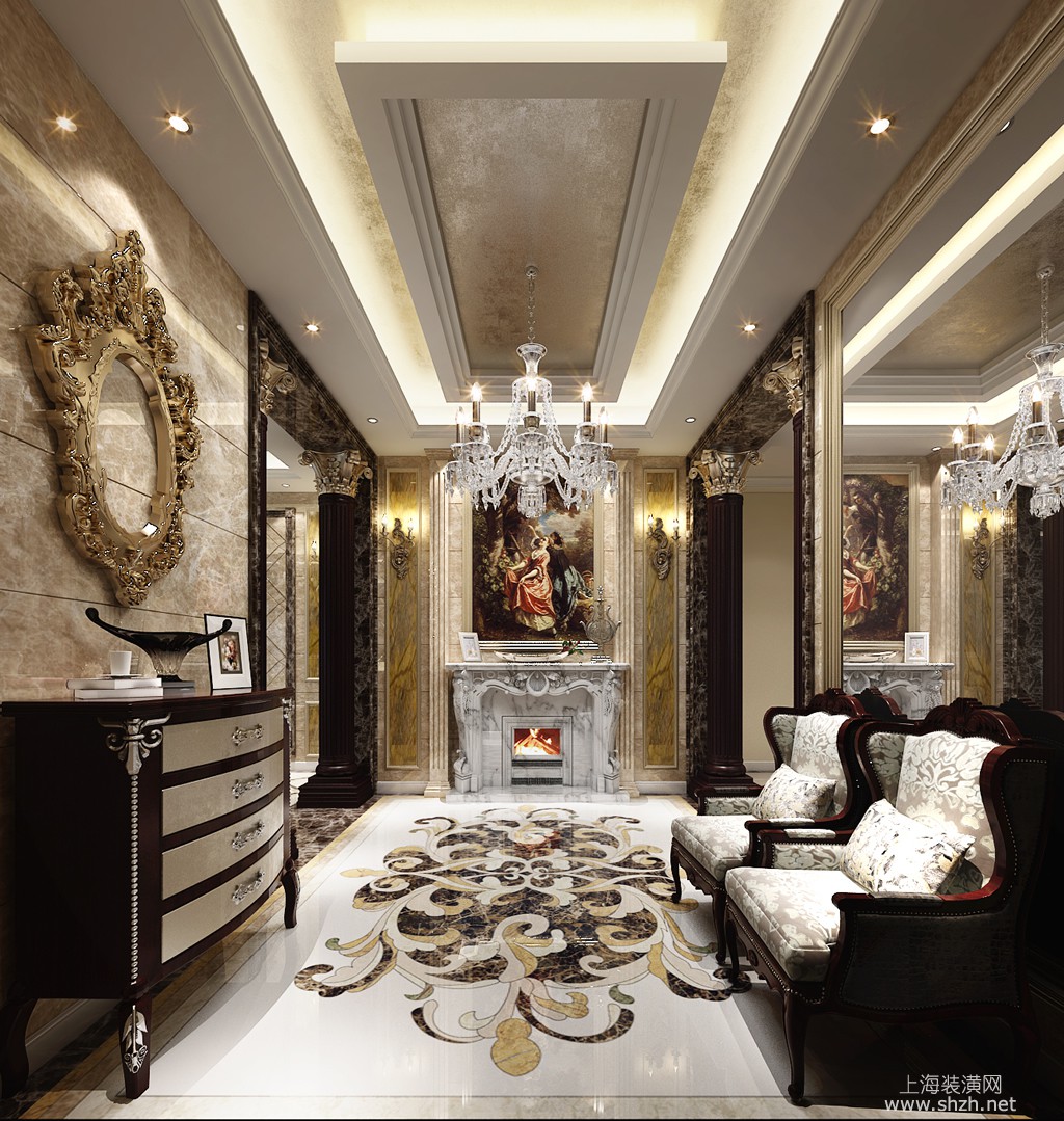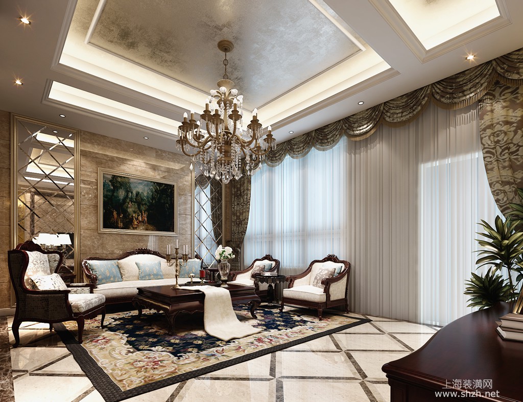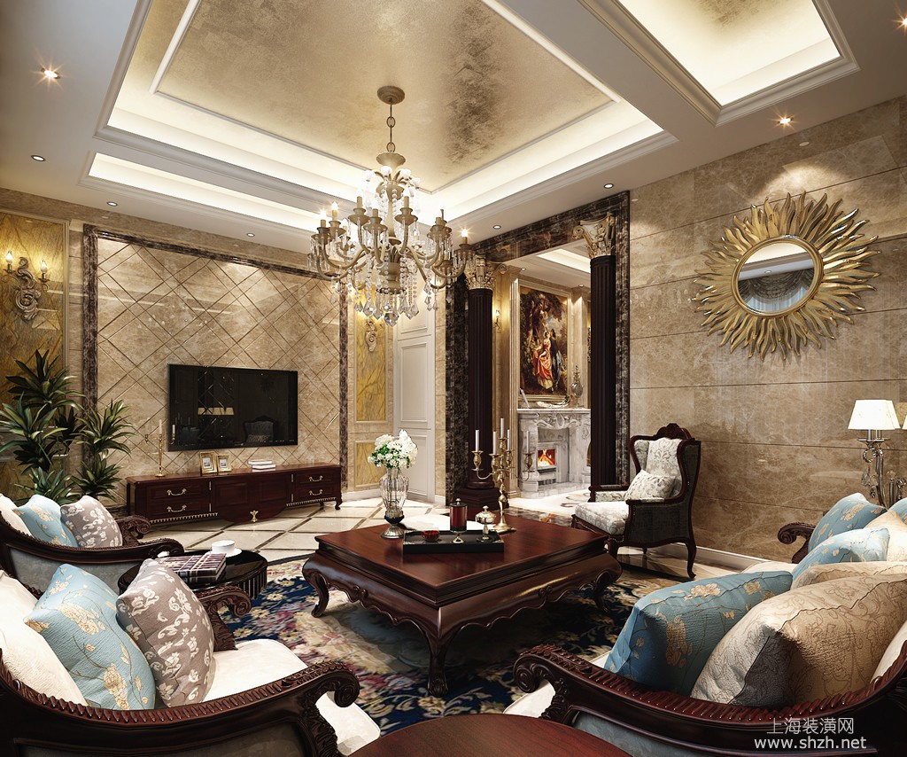 颐景园客厅.jpg - 整个空间弥漫着奢华与浪漫的气氛,硬朗的材质,明快的色彩、柔美的家具、雅致的配饰,赋予空间素净、明亮的神采。空间一方面保留了材质,色彩的大致风格,仍然可以很强烈的表现传统的历史痕迹与浑厚的文化底蕴,同时又摒弃了过于复杂的肌理和装饰,简化了线条。