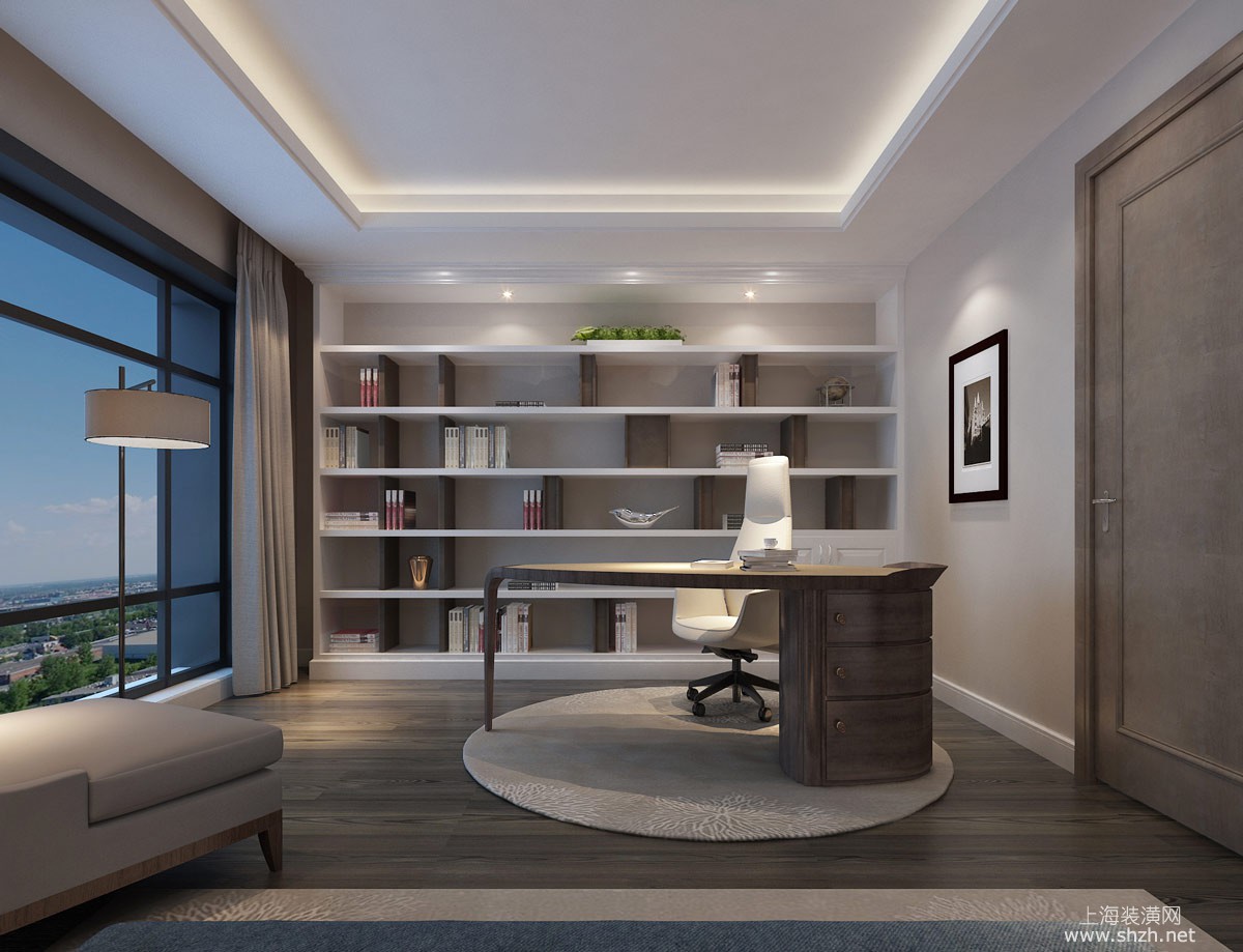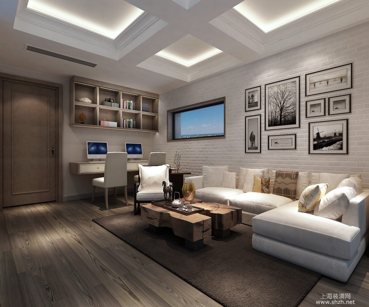 明泉璞院书房.jpg - 运用简洁的线条,柔和的色彩,将家居空间打造得清爽而极具现代感。复古的豪华沙发和几案延续米黄色简约,中间缀以蓝色沙发与脚凳。洁白的吊灯、悬于墙壁的水晶装饰物与相片,使得空间灵动起来,充满现代气息。多处摆放花盆与花瓶,使室内洋溢着温馨和舒适的自然气息。