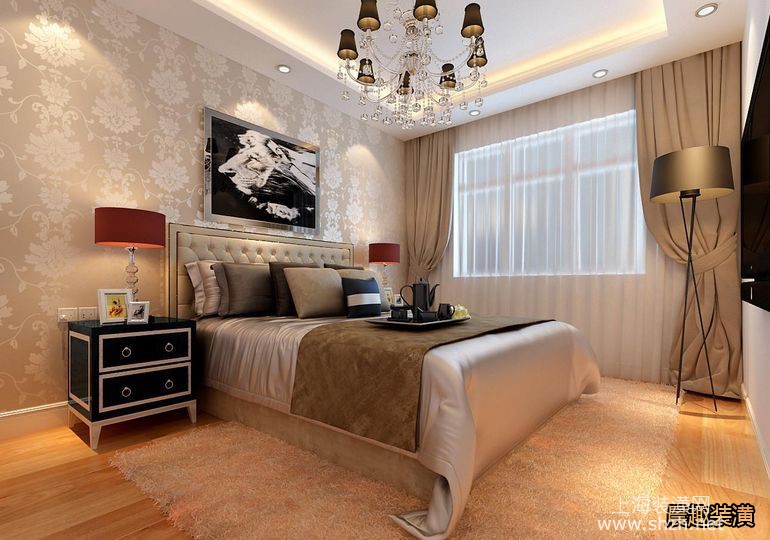 骏华苑卧室.jpg - 本方案的设计风格为北欧低调奢华,结合客户的生活习惯以及对家的要求设计了开敞式厨房和吧台。电视墙运用了花色玻璃满足了男主人对客厅的要求低调、时尚、大气,同时从视觉上增加了客厅的宽度。沙发采用的浅咖布艺沙发,自然舒适,经久耐用,阳台榻榻米的设计,增加了孩子的玩耍区,以及家长的休闲工作区,可以说是多功能区。卧室同样采用浅咖色调,优雅,温馨。
