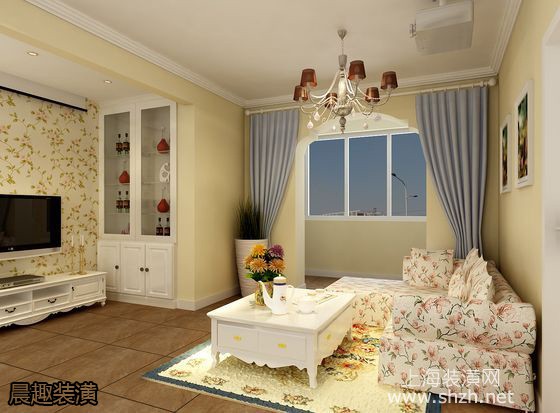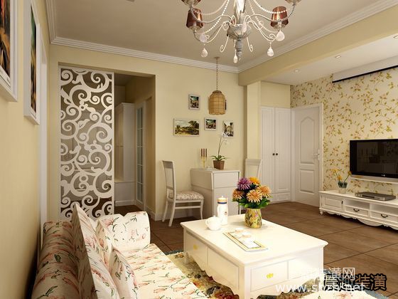 君莲新城客厅.jpg - 此户型以韩式田园风格为主,其中也加入了一些古典欧式的设计元素,但又打破了纯古典欧式的局限,以曲线法则(像通向阳台的那个口,采用圆弧曲线处理,更加柔和)和非对称法则,再加上色彩柔和艳丽,营造了一个充分崇尚自热的家居空间。客厅电视背景墙使用的是和周围墙壁同色系的碎花壁纸,使整个客厅更连贯,和谐。而主要的韩式田园,使房间充满了民间乡土风情,和谐又不失优雅。