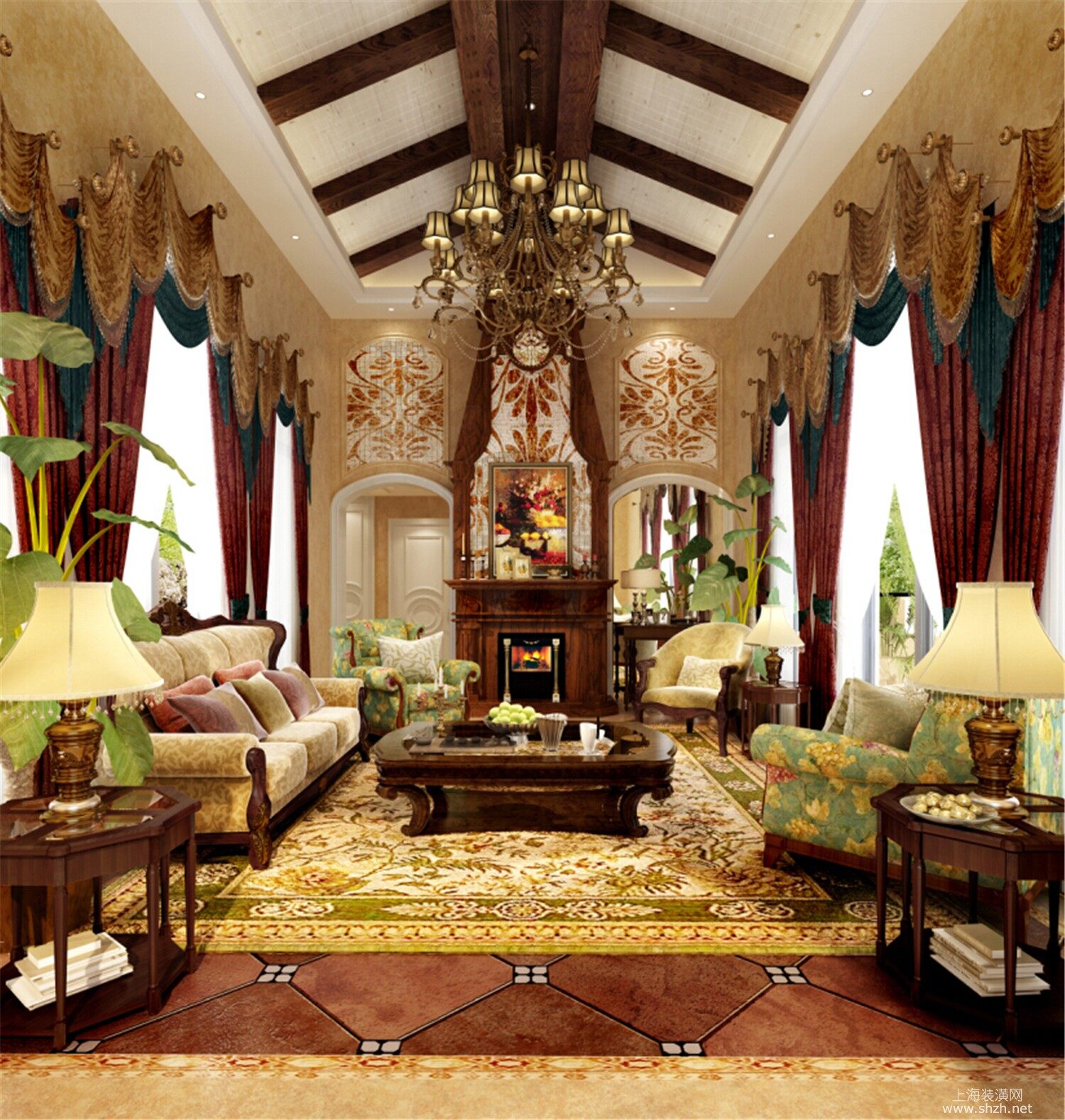 客厅 - 绿洲比华利花园别墅装修美式风格设计,上海腾龙别墅设计作品!