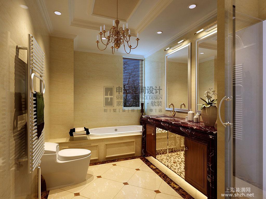 嘉宝梦之湾卫生间.jpg - 简洁的拼花与艺术顶面造型,灯饰的搭配,简洁不单调。