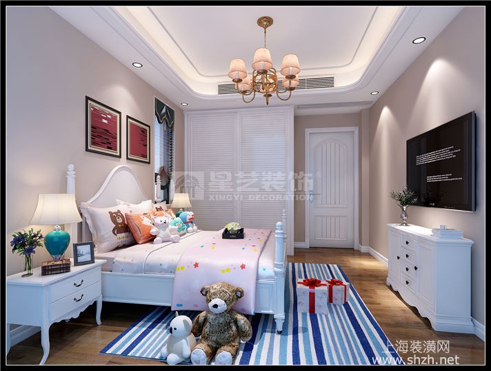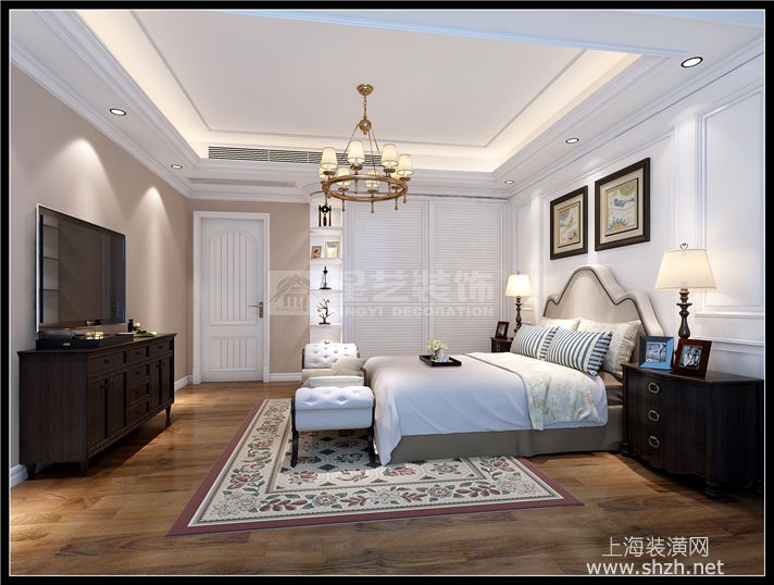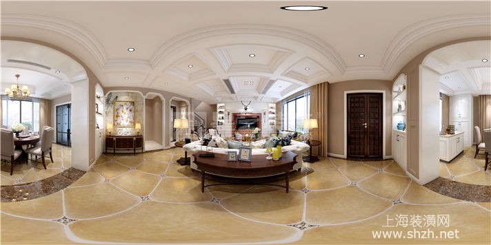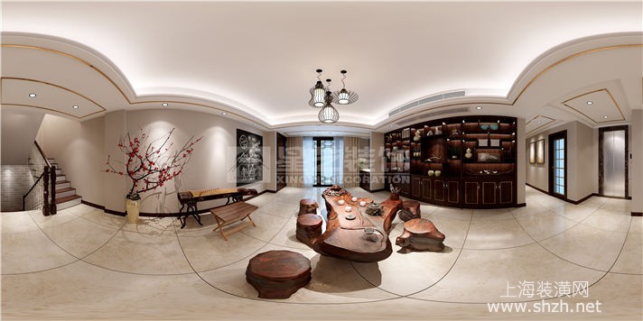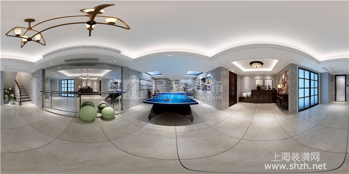 负二层娱乐室_副本.jpg - 设计师以现代美式风格刻画家居面貌,并以开放式的格局扩充空间视野,墙面以米黄色墙漆为背景色,配以深棕色实木家具,地面采用仿古砖,休闲气息中不失雅致氛围。客厅中心用裸露红砖砌成壁炉样式,配以鹿头装饰,不经意中展现北美狂野风情。天花层次井然,厚重而又不失灵巧。男业主平时有饮茶习惯,因此在地下一层开辟了一个专门用来喝茶的休闲空间,地下二层则是一家人锻炼的地方,设计师还细心的为学习舞蹈的小女儿准备了整面墙的镜子和压腿的器材。配饰方面,碎花壁纸和东方元素的加入给朴实温馨的家居又带来一丝活泼优雅的气息,打造出颇具美感,又颇具内涵的生活空间。