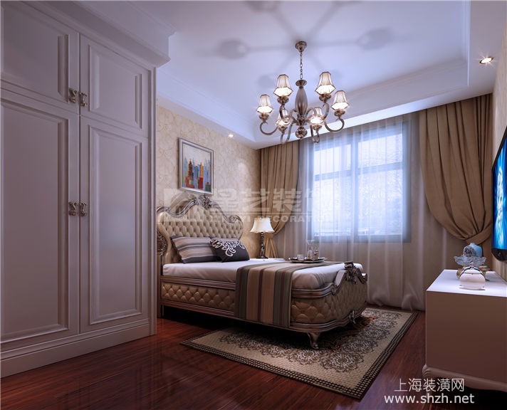 次卧.jpg - 本案运用墙纸、大理石、顶面石膏雕花,打造出了一个高贵典雅又不失生活气息的空间。天花顶面的石膏雕花给人一种惊艳的视觉盛宴,仿佛置身于宫殿一般。但是各个房间又给人一种家的踏实感。高贵中带着家的气息。于两个空间中穿梭仿佛参加了一场盛宴后回到了家中一般。