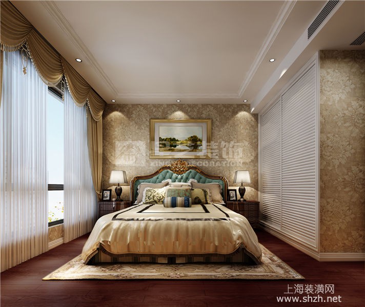 主卧.jpg - 本案运用墙纸、大理石、顶面石膏雕花,打造出了一个高贵典雅又不失生活气息的空间。天花顶面的石膏雕花给人一种惊艳的视觉盛宴,仿佛置身于宫殿一般。但是各个房间又给人一种家的踏实感。高贵中带着家的气息。于两个空间中穿梭仿佛参加了一场盛宴后回到了家中一般。