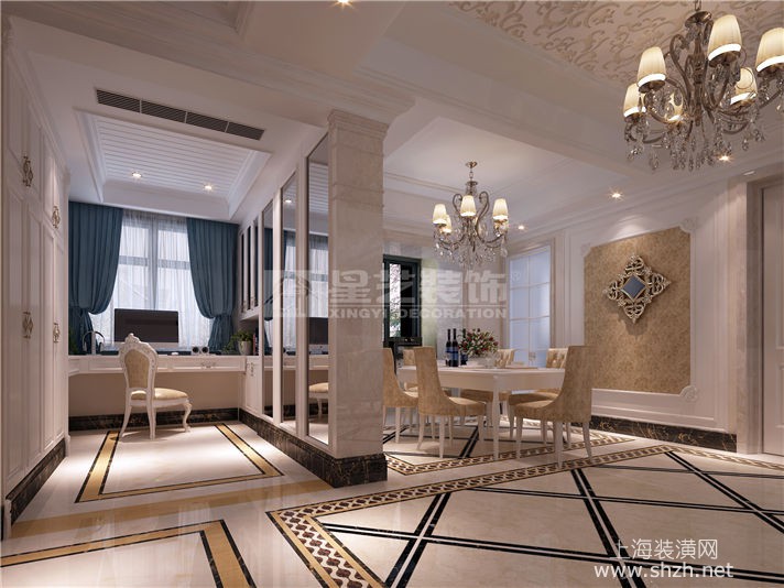 书房.jpg - 本案运用墙纸、大理石、顶面石膏雕花,打造出了一个高贵典雅又不失生活气息的空间。天花顶面的石膏雕花给人一种惊艳的视觉盛宴,仿佛置身于宫殿一般。但是各个房间又给人一种家的踏实感。高贵中带着家的气息。于两个空间中穿梭仿佛参加了一场盛宴后回到了家中一般。