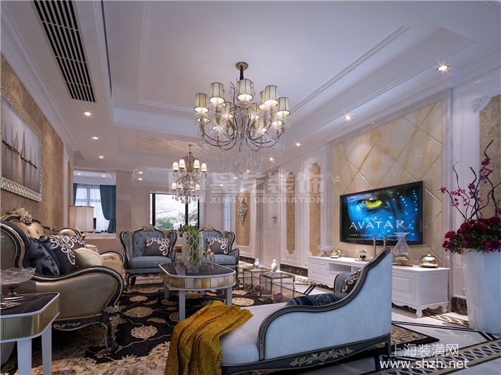 客厅.jpg - 本案运用墙纸、大理石、顶面石膏雕花,打造出了一个高贵典雅又不失生活气息的空间。天花顶面的石膏雕花给人一种惊艳的视觉盛宴,仿佛置身于宫殿一般。但是各个房间又给人一种家的踏实感。高贵中带着家的气息。于两个空间中穿梭仿佛参加了一场盛宴后回到了家中一般。