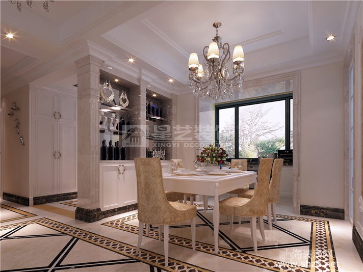 餐厅 .jpg - 本案运用墙纸、大理石、顶面石膏雕花,打造出了一个高贵典雅又不失生活气息的空间。天花顶面的石膏雕花给人一种惊艳的视觉盛宴,仿佛置身于宫殿一般。但是各个房间又给人一种家的踏实感。高贵中带着家的气息。于两个空间中穿梭仿佛参加了一场盛宴后回到了家中一般。