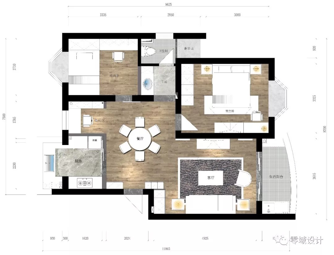 平面布置图 - ■ 设计优化: ◢ 缩短了过道距离,采光更好并且增大了活动空间。 ◢ 主卧达到了南北通透的效果。 ◢ 餐厅融合过首,空间使用更加灵活。 ◢ 原厨房位置改成电玩区,满足业主需求。 ◢ 厨房改到原餐厅阳台位置,节省空间。 ◢ 北次卧改变进门位置,活动动线更加合理。并且使用了谷仓门设计,风格独特不占空间。 ◢ 增加了卫生间面积,做了干湿分离,方便维持整体环境的整洁美观。