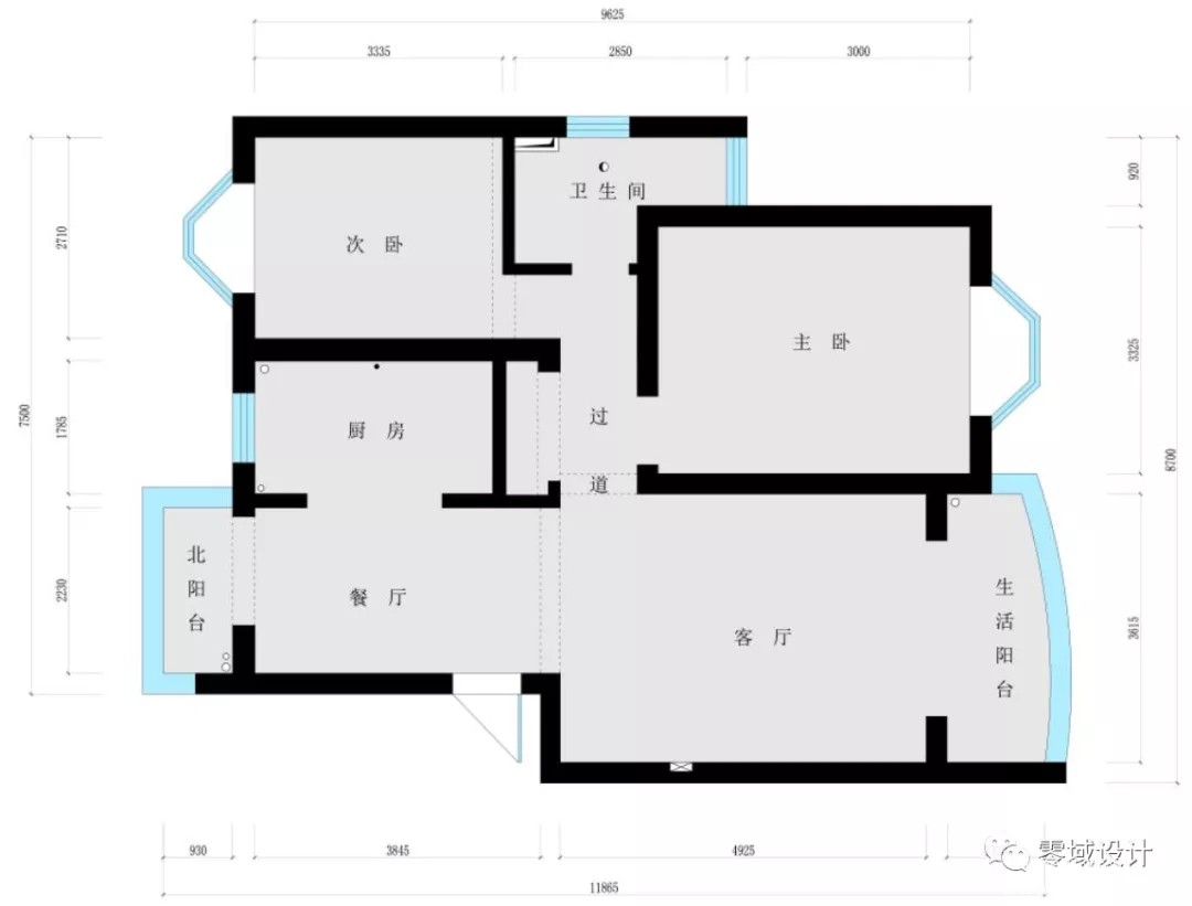 原始结构图 - ■ 户型分析: ◢ 过道狭长,光线昏暗。 ◢ 餐厅较小,空间有限。 ◢ 主卧通风性不够好。 ◢ 北阳台空间有限,希望更好利用空间。 ◢ 业主希望增加一个电玩区