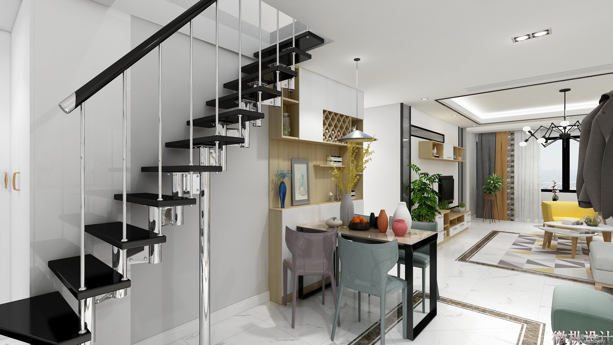 功能区 - 楼梯的黑色和银色搭配 结合电视背景墙的色系 相呼应 让楼梯也成为了家里的一种装饰 和高格调 而不是累赘的占空间.