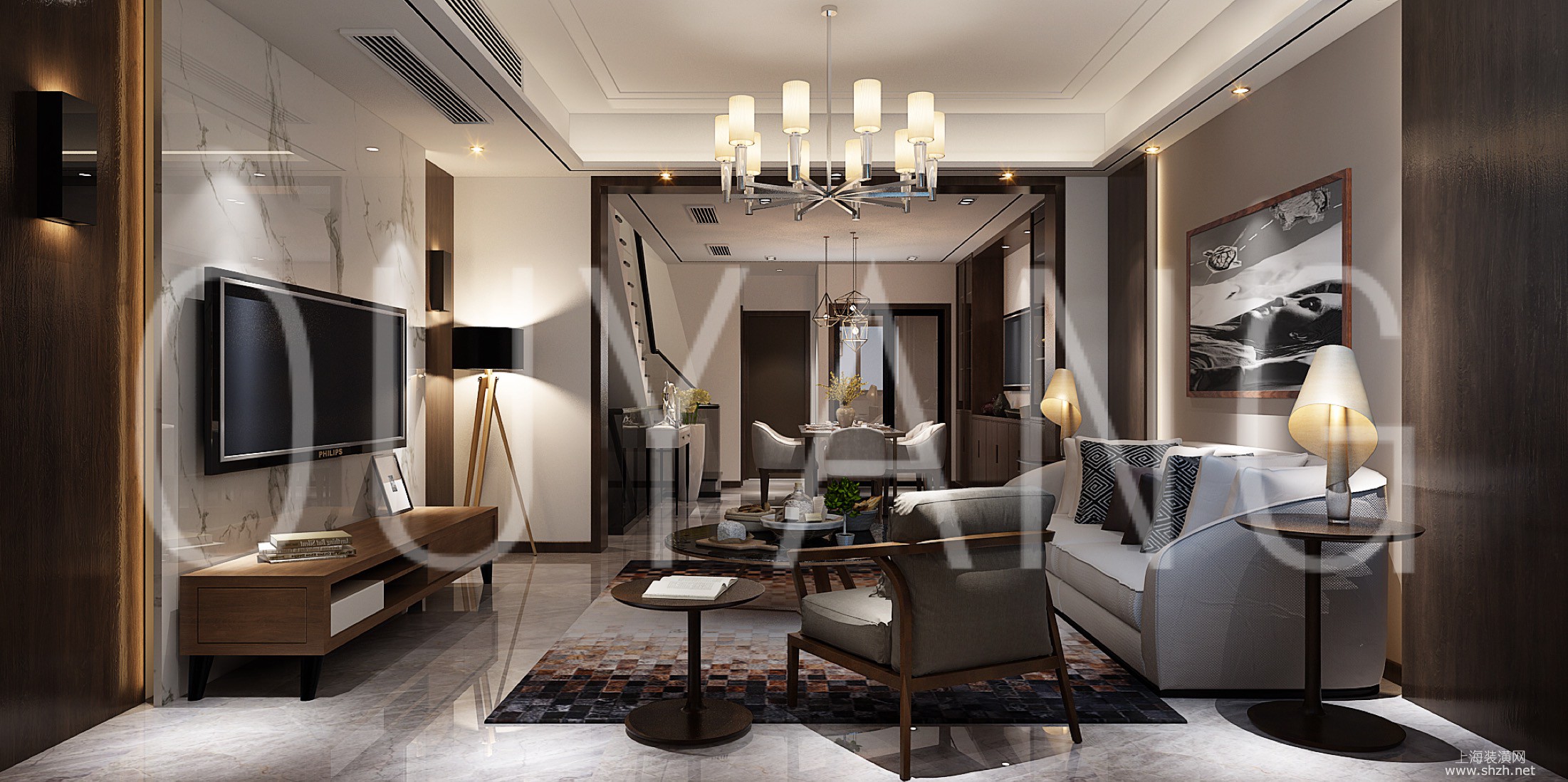 客厅.jpg - 风雅吴地,水墨江南,留下无数文人墨客的行踪,也留下人们印象中的一幅浓淡适宜的水墨长卷。客厅与主卧以沉稳的木色调为主,女儿房则偏向恬淡的浅色系,电视背景墙选用山水大理石与护墙板的碰撞,不仅使人视线得到扩展,更是体现了空间设计中,有限空间里制造纵深感的设计理念。