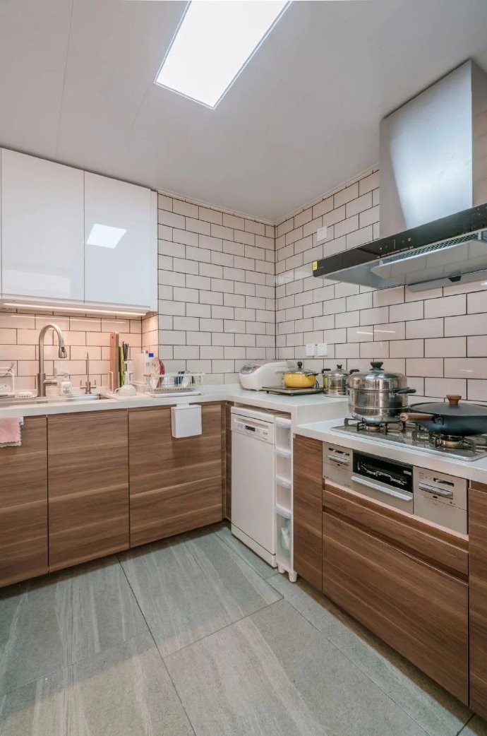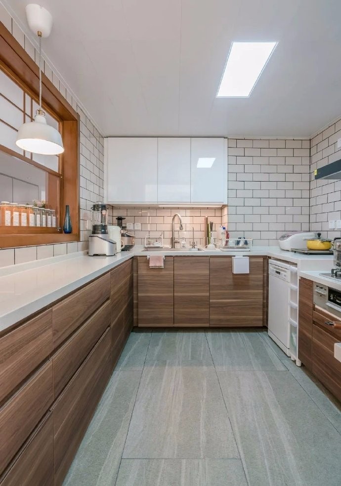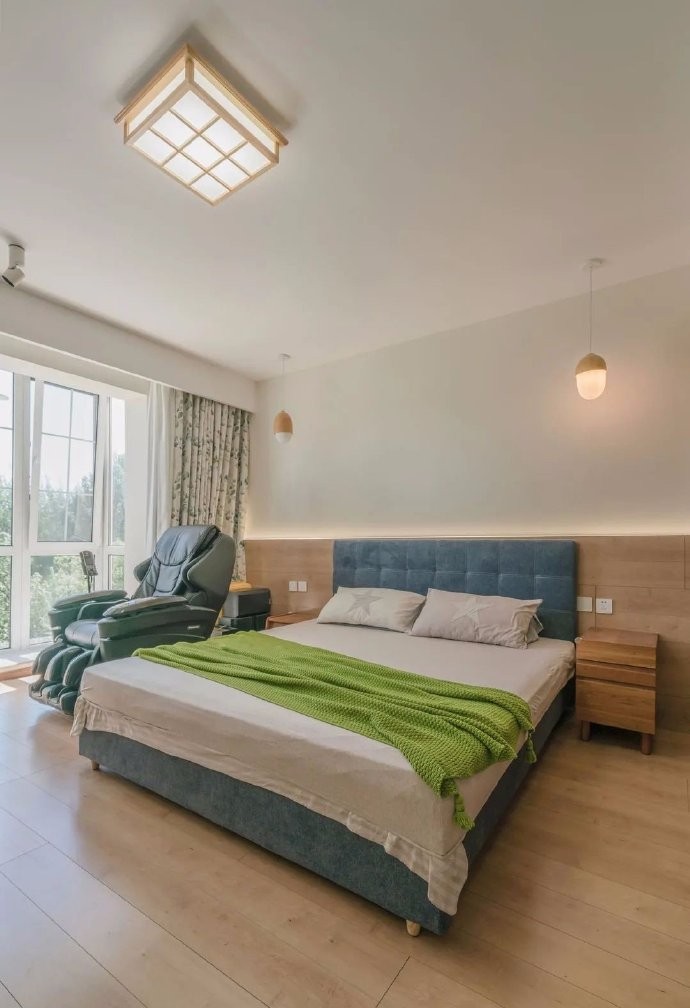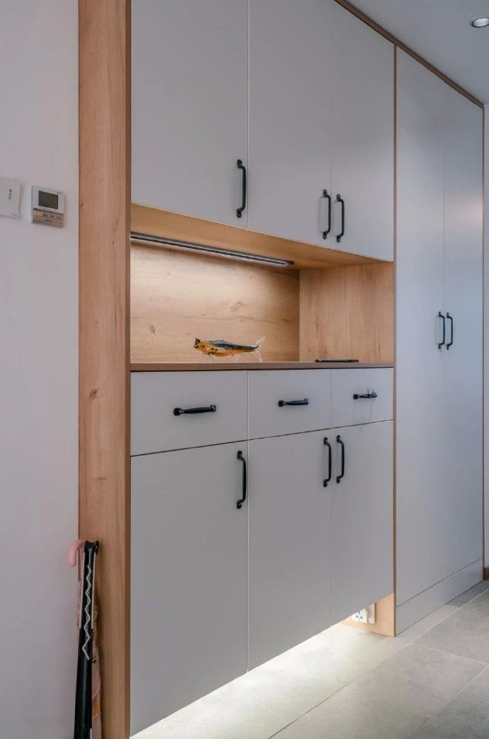 135㎡三房日式复古风 【客厅】只要一面采光的大落地窗,而北侧餐厅是没有窗户的。所以拆改了厨房和阳台格局,新的布局可以在下午的时候,西侧阳光直射到餐厅空间,让这个新家充满了阳光的温暖的味道。 菱形带格子的落地窗,阳光透过绿意盎然的树丛洒进屋子里来,纯白色的墙面与木色的温润,是光影的背景色,流畅的线条附着在木作上,利落分明,浅色温暖,深色沉稳,空间简约而饱满。 【主卧】室原木色墙板与地板,让空间温暖舒适。卧室的衣柜,是让木工做出墙体空间,单独定制折叠门后,里面放上架子来挂衣服。 【厨房】做了的上下推拉窗,可以与餐厅有家庭互动,可以传菜传水果。很像日式街边的小咖啡馆。洗碗机与煤气灶的位置设计成跌级的形式,使用起来更方便,尺寸高度都很合适。 【洗手间】日式三分离式,洗漱、淋浴、马桶间完全独立,为生活营造充足的独立空间。 【餐厅】原来的厨房门洞扩大后改成了上下可以推拉的窗户,可以用来传菜。 原来阳台的小窗户改成了进入厨房的门,午后的斜阳温暖惬意,特别是傍晚,煮杯咖啡,享受慢慢的阳光。餐边柜设计成上面是黑色柜门的吊柜,成为家庭平时写写画画的小黑板。 【玄关】对面是进门定制鞋帽柜,下面悬空打上灯光,可以放拖鞋,和扫地机器人。中间做空可以放包包。门板白色与侧板木纹色齐平,这样木线清晰明了有线条感。