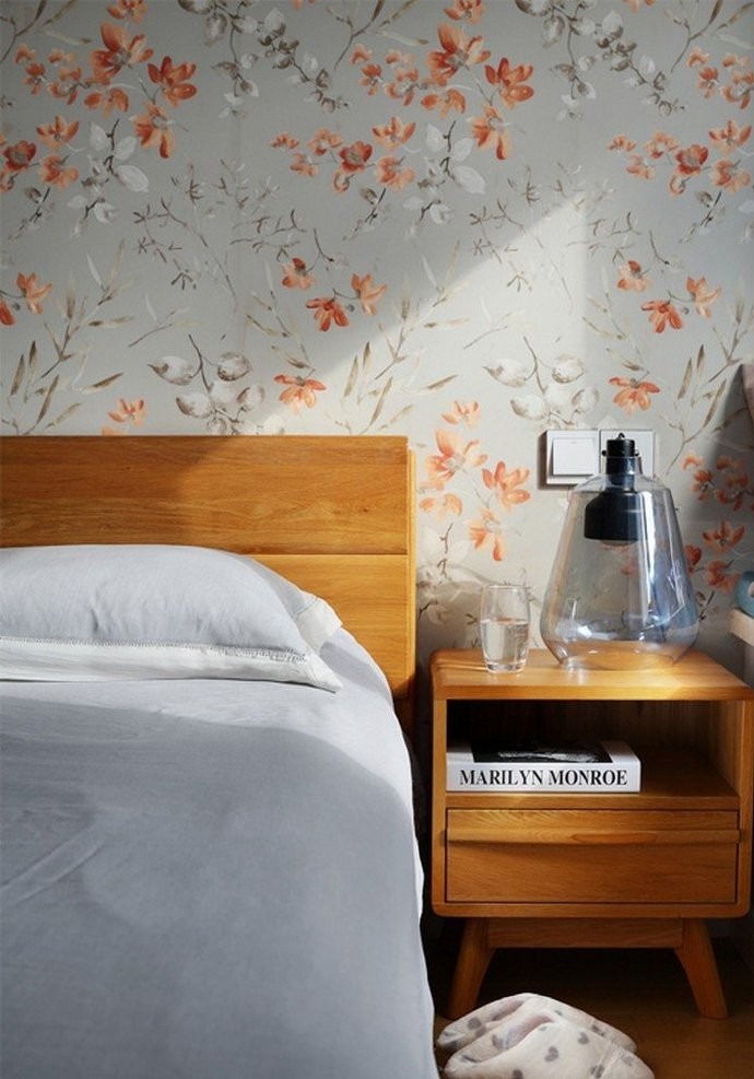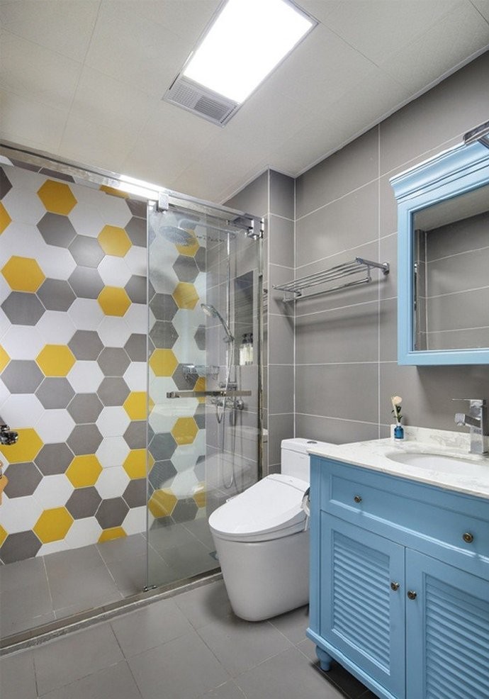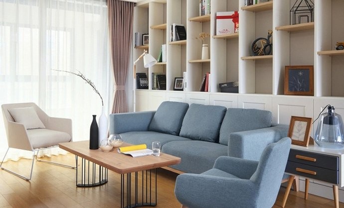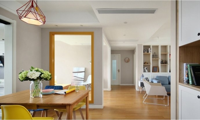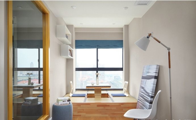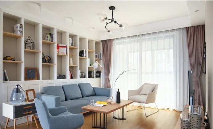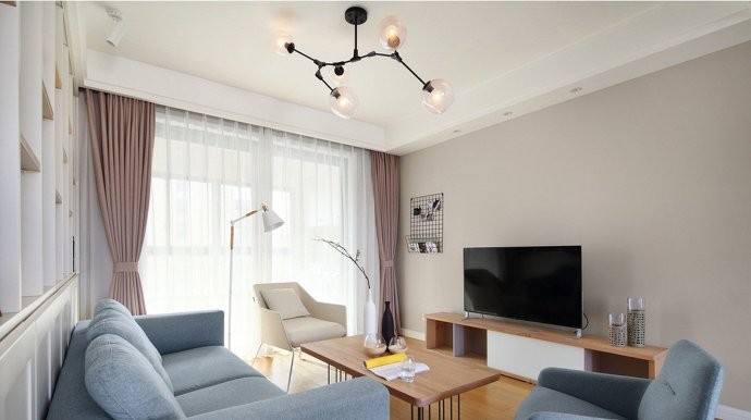 ??客厅 米色布艺窗帘与暖灰色电视背景墙面用色自然统一,原木色电视柜穿插白色,线条干净利落。 客厅蓝色布艺沙发与木色地板形成冷暖对比,白色落地灯营造温馨舒适的感觉。 ??卧室 主卧原木色家具搭配灰色的床品,简洁素雅的同时却凸显出了带花图案壁纸的靓丽。 敞开休闲空间木质榻榻米材料用色与地板用色统一,榻榻米不仅可休闲也可功能性储物。蓝色的布艺窗帘与蓝色的储物桶形脚蹬颜色也相。 ??厨房 厨房色调上以黑白色为主,黑与白是极简***的代表色。 深灰色水泥砖,白色橱柜,整个厨房空间线条简洁,黑白对比明确,让人看上。 白色塑料餐椅与原木色餐桌搭配,现代与自然元素相结合,让空间增加一丝亲近之感。 多种暖色调的融合,让餐厅氛围立刻活跃起来,头上的小吊灯不失可爱调皮,也让用餐生活更有情趣。 ??卫生间 生间跳跃的六角墙砖配上灰粉色台盆柜,让灰色水泥砖显得不那么生硬而冷。