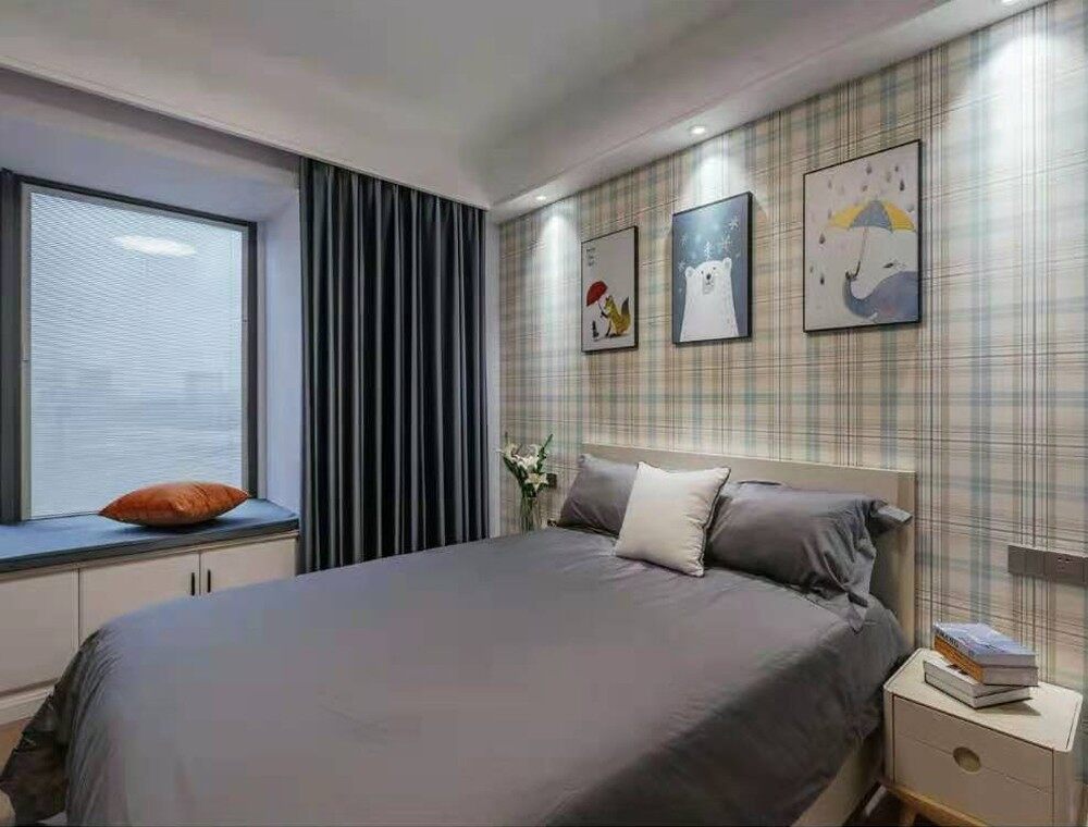 主卧背景墙以灰色为主色调,贴合空间主人的沉稳个性,灰蓝色的窗帘及围边瞬间让整个空间变得很柔和