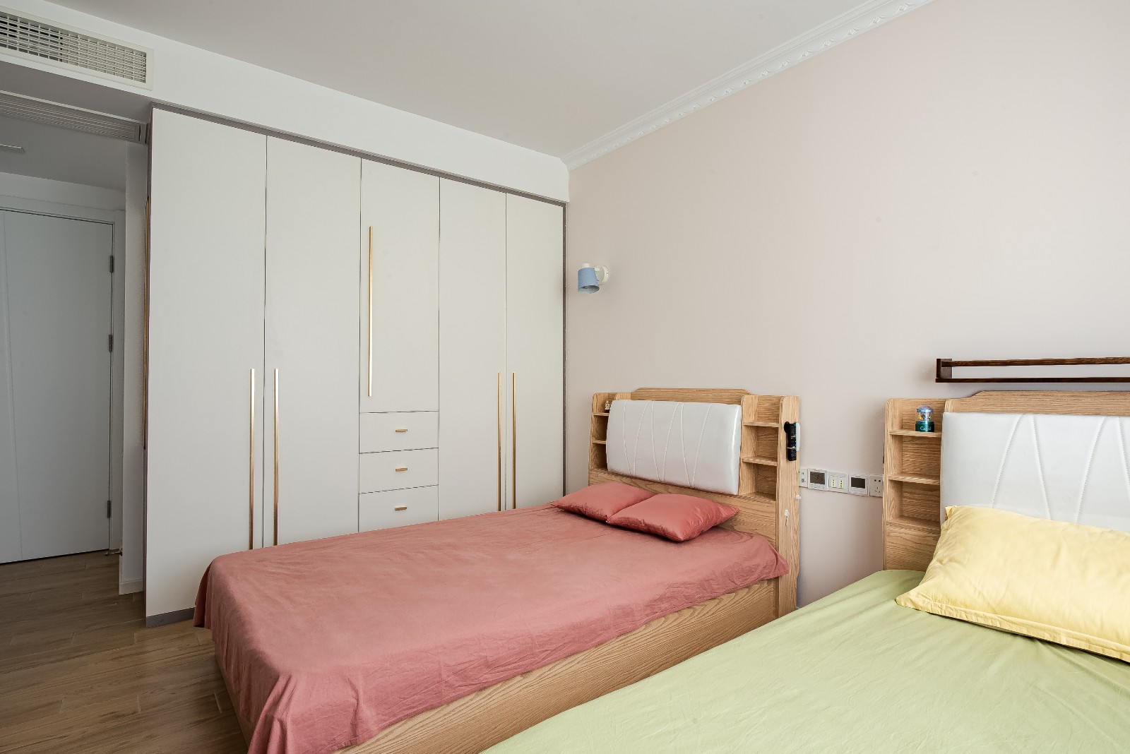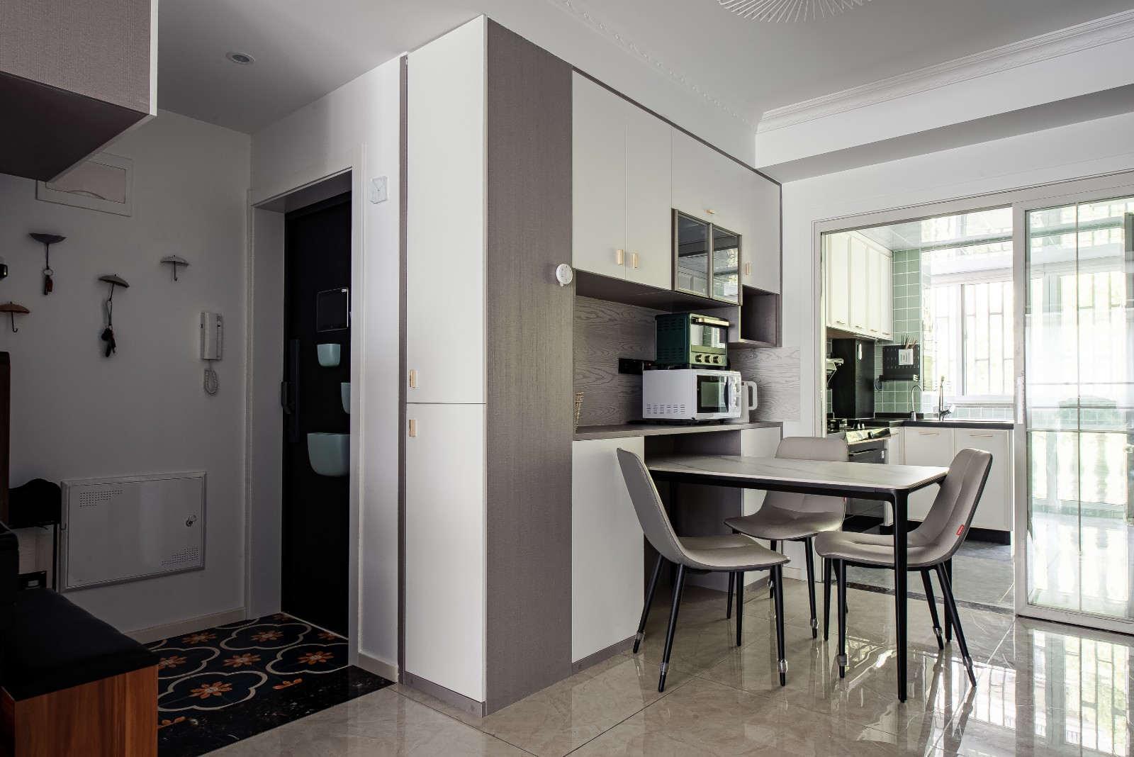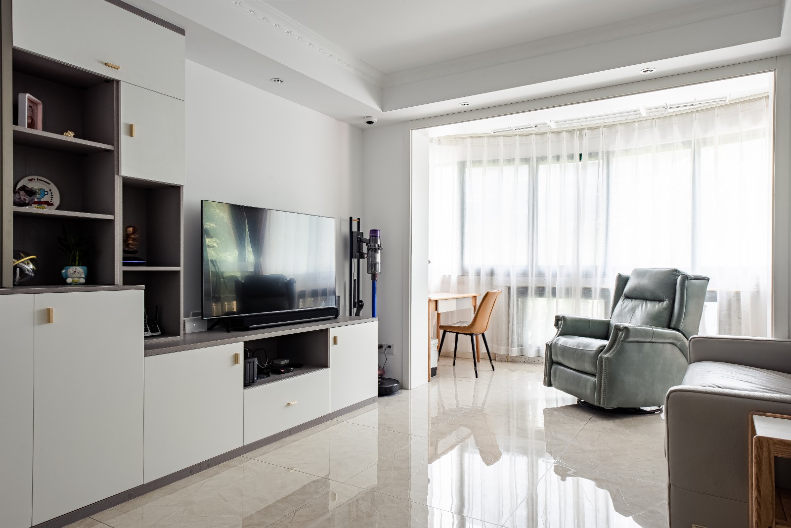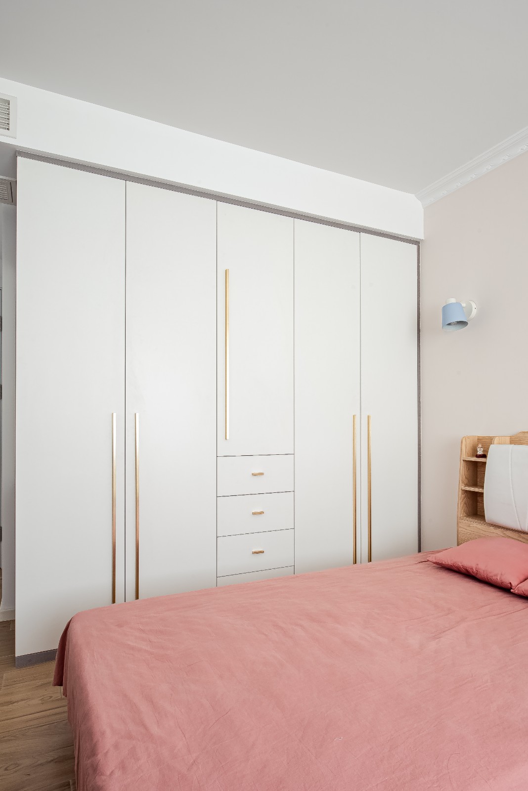 很多买了精装房的住友们都有想改造却不知如何下手的困扰。今天给大家推荐的这个案例仅用10w就将精装房改造的高级又简约。 整体色彩布置的没有采用太暗的元素,设计师 在主卧处增设了通顶柜体,增加了储物空间,提升了空间的利用率,采用灯带与筒灯来照明,解决了采光问题也为空间增添了温馨感。客厅显得更有设计感,灰色的皮艺沙发搭配糖果绿石膏线边框线条,石膏线的做法简单,简约有趣的挂画做点缀,让简约的空间多了几分慵懒与有趣。