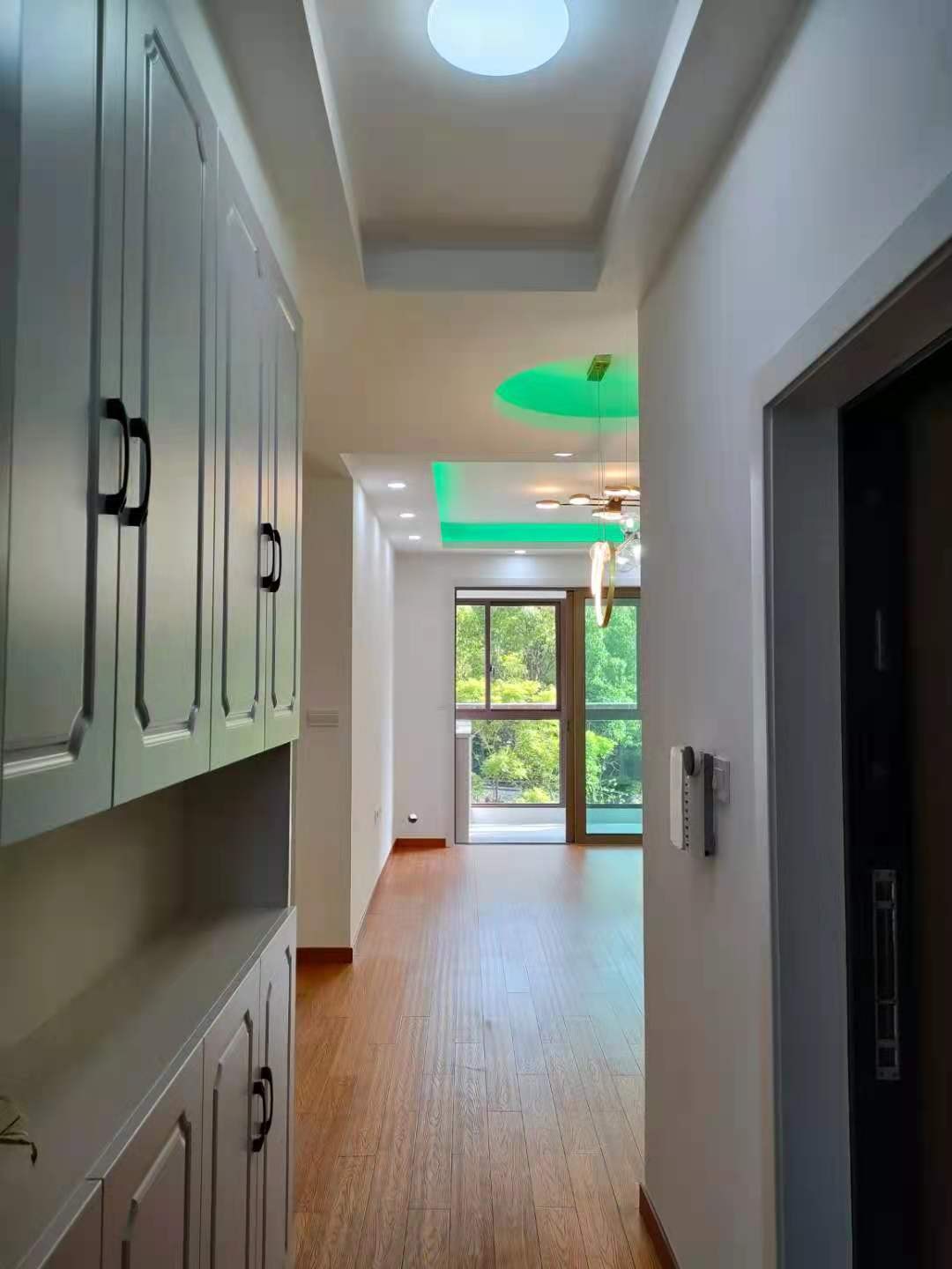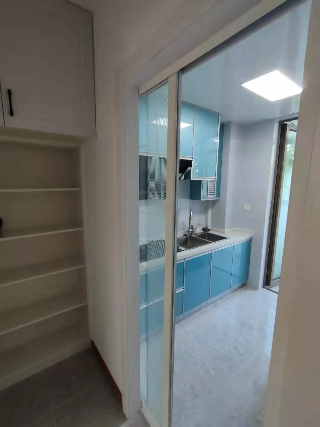 进门左手边厨房隔断放冰箱,冰箱后面及顶上做了储物柜,不浪费空间