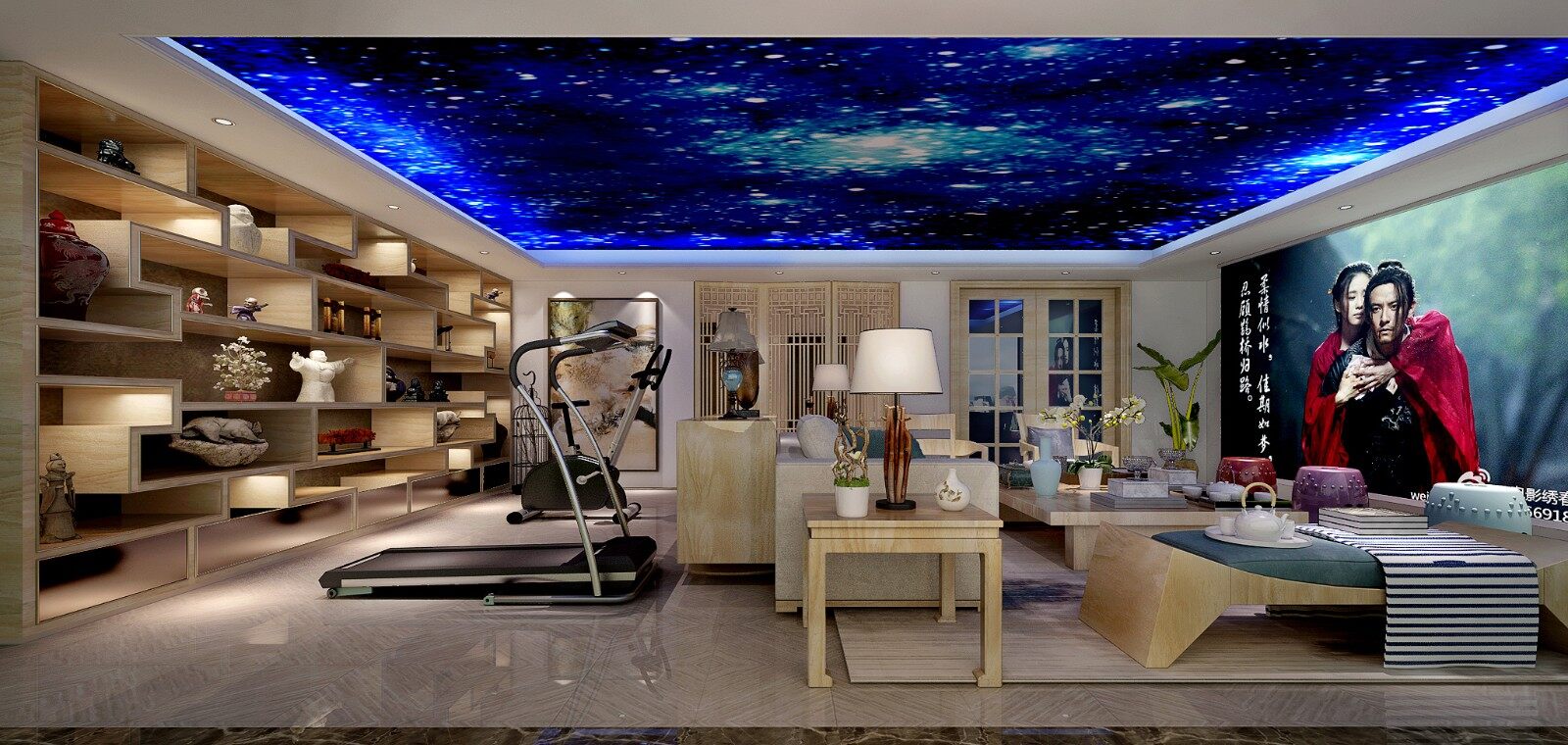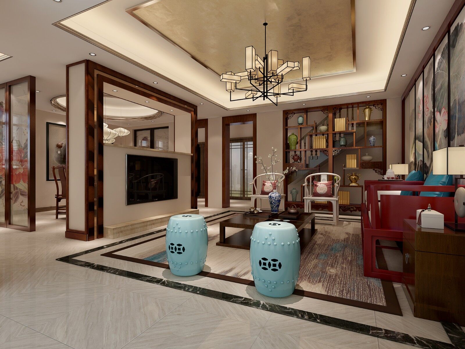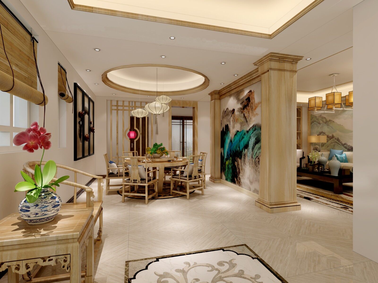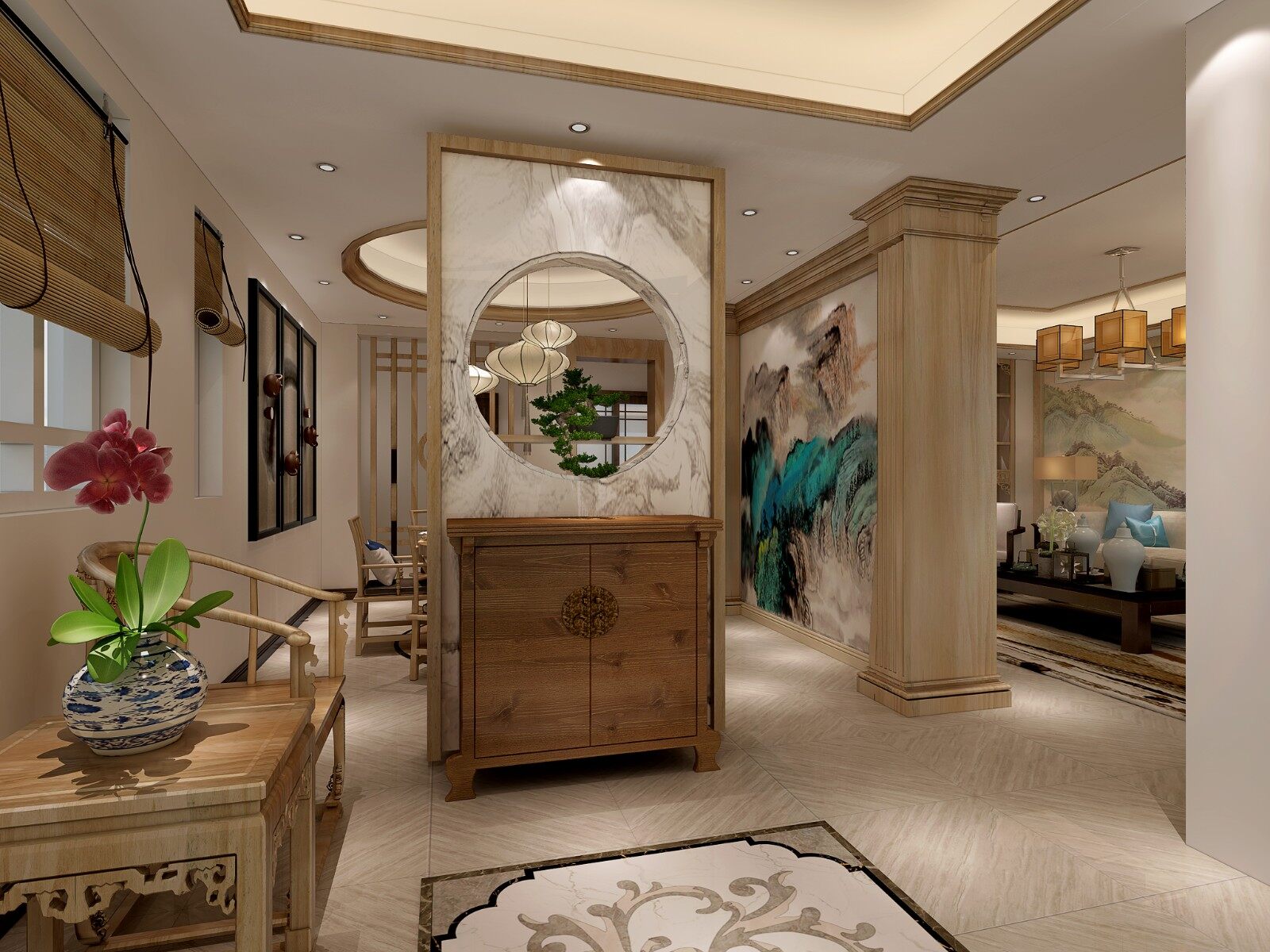 中式为主,整个空间弥漫着原木元素的气氛,原木的材质,明快的色彩、柔美的家具、雅致的配饰,赋予空间素净、明亮的神采。 空间一方面保留了材质,色彩的大致风格,仍然可以很强烈的表现传统的历史痕迹与浑厚的文化底蕴,同时又摒弃了过于复杂的肌理和装饰,简化了线条。组合家具的颜色选用白色和流行色,仿佛为主人编织了一个明快美丽的梦想。在整个空间里以营造浓郁的艺术氛围,表现主人的文化素养。灯自然不可或缺,它被安置在空间的交汇处,又与色彩鲜艳的画相呼应,本案强调表面装饰,多运用细密绘画的手法,具有丰富华丽的效果。