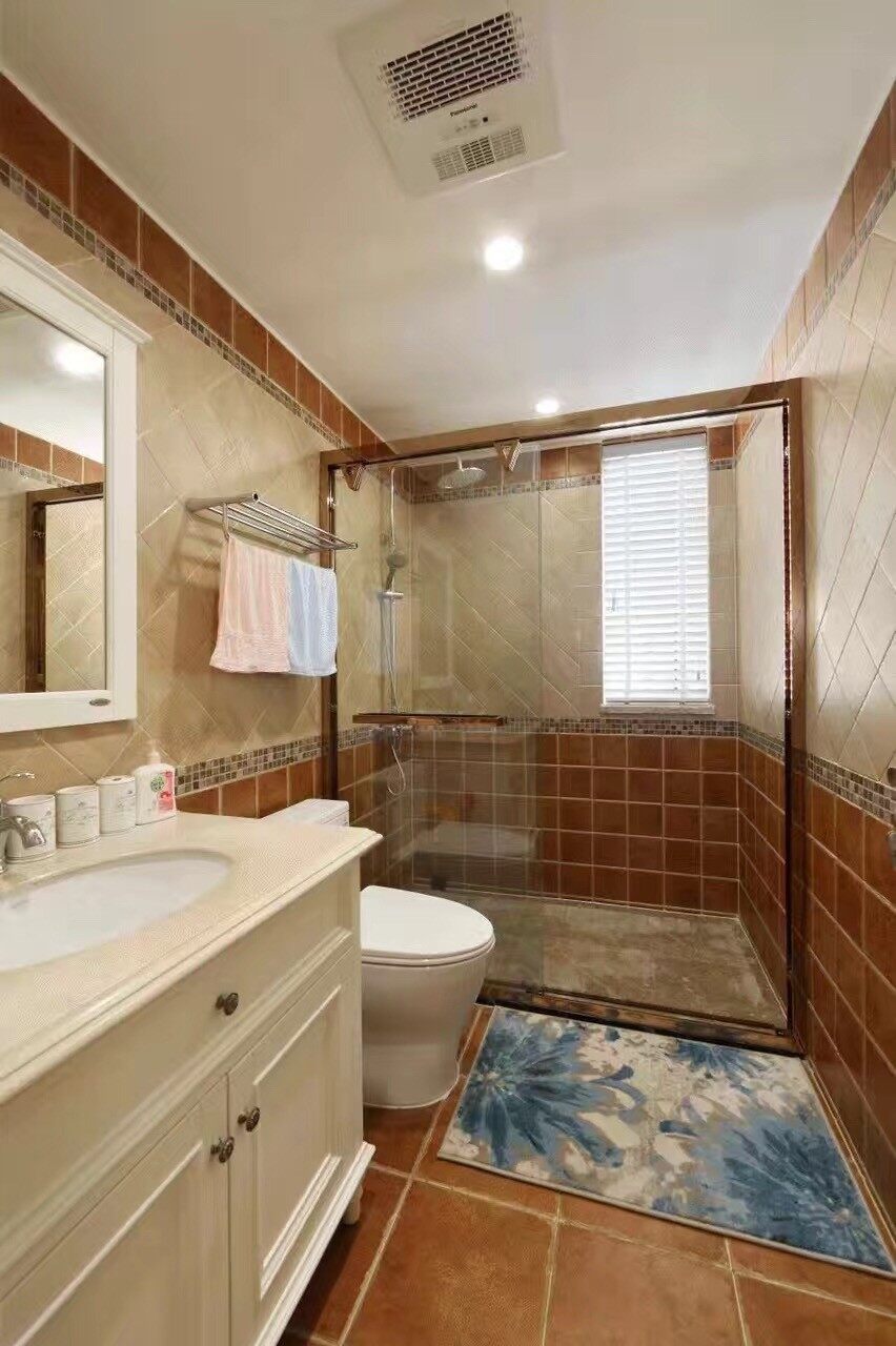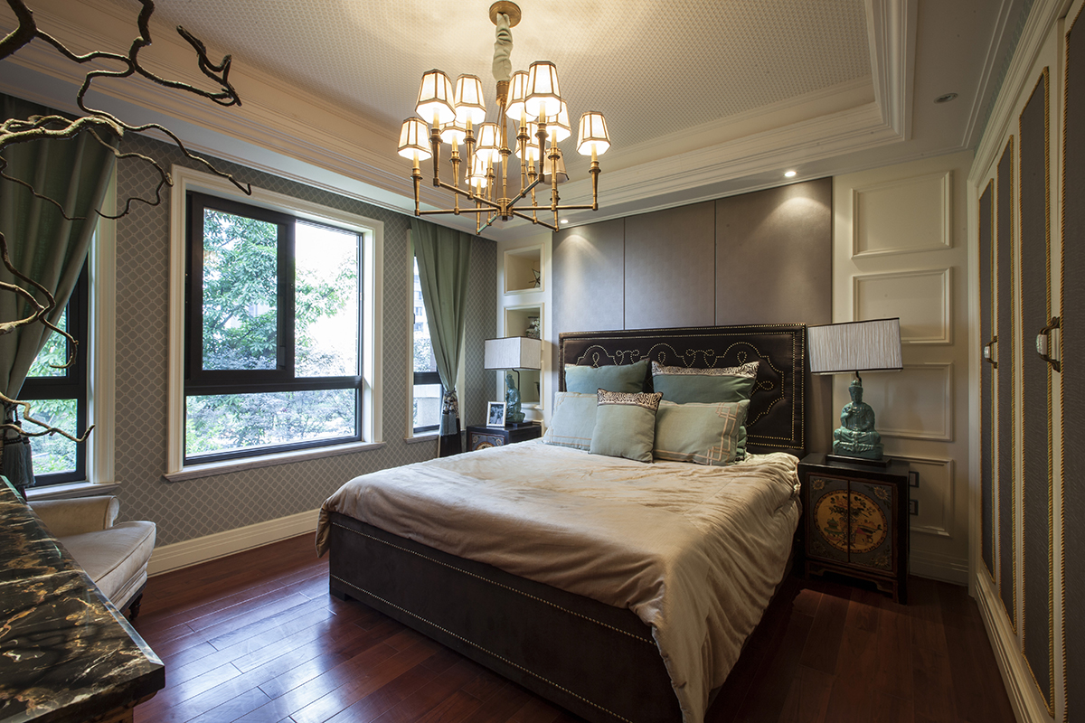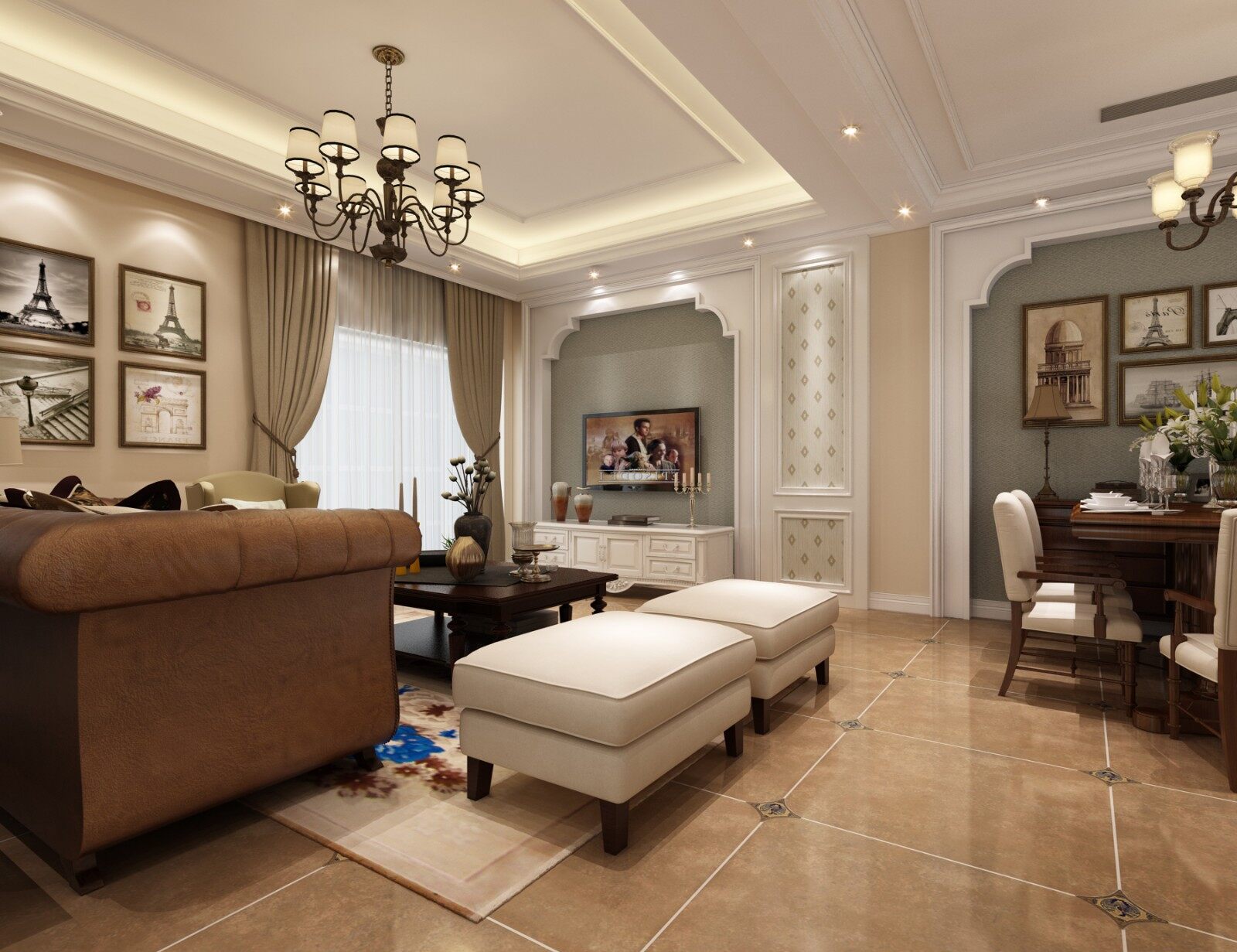 美式风格设计理念表现为追求华丽、高雅的古典风格。居室色彩主调为白色,家具为古典弯腿式,家具、门、窗漆成白色,擅用各种花饰、丰富的木线变化、富丽的窗帘帷幄是西式传统室内装饰的固定模式,空间环境多表现出华美、富丽、浪漫的气氛。 客厅风格较多采用嵌入式石膏吊顶,搭配精致的水晶吊顶,营造出一种怀旧、浪漫的感觉。以大理石作为地面装饰材料,光泽感极佳,在沙发区铺上大幅花纹地毯,使空间区域划分更加清晰