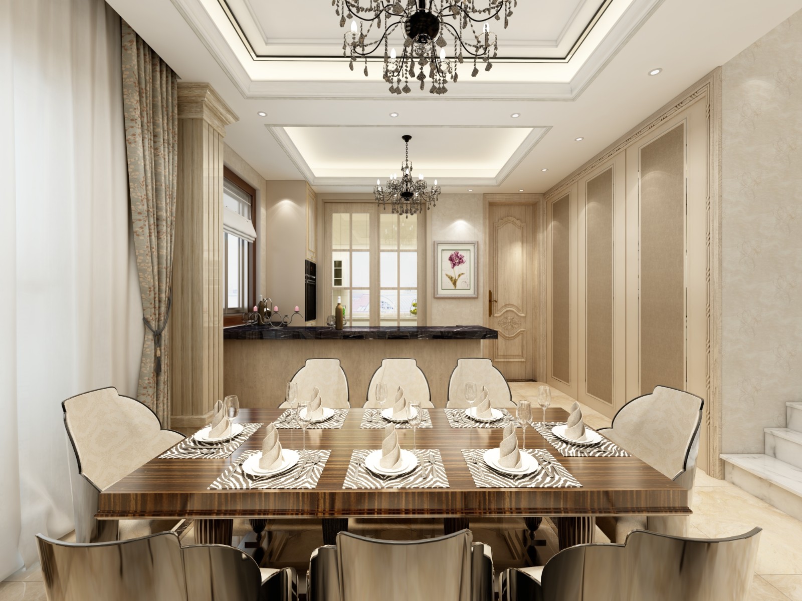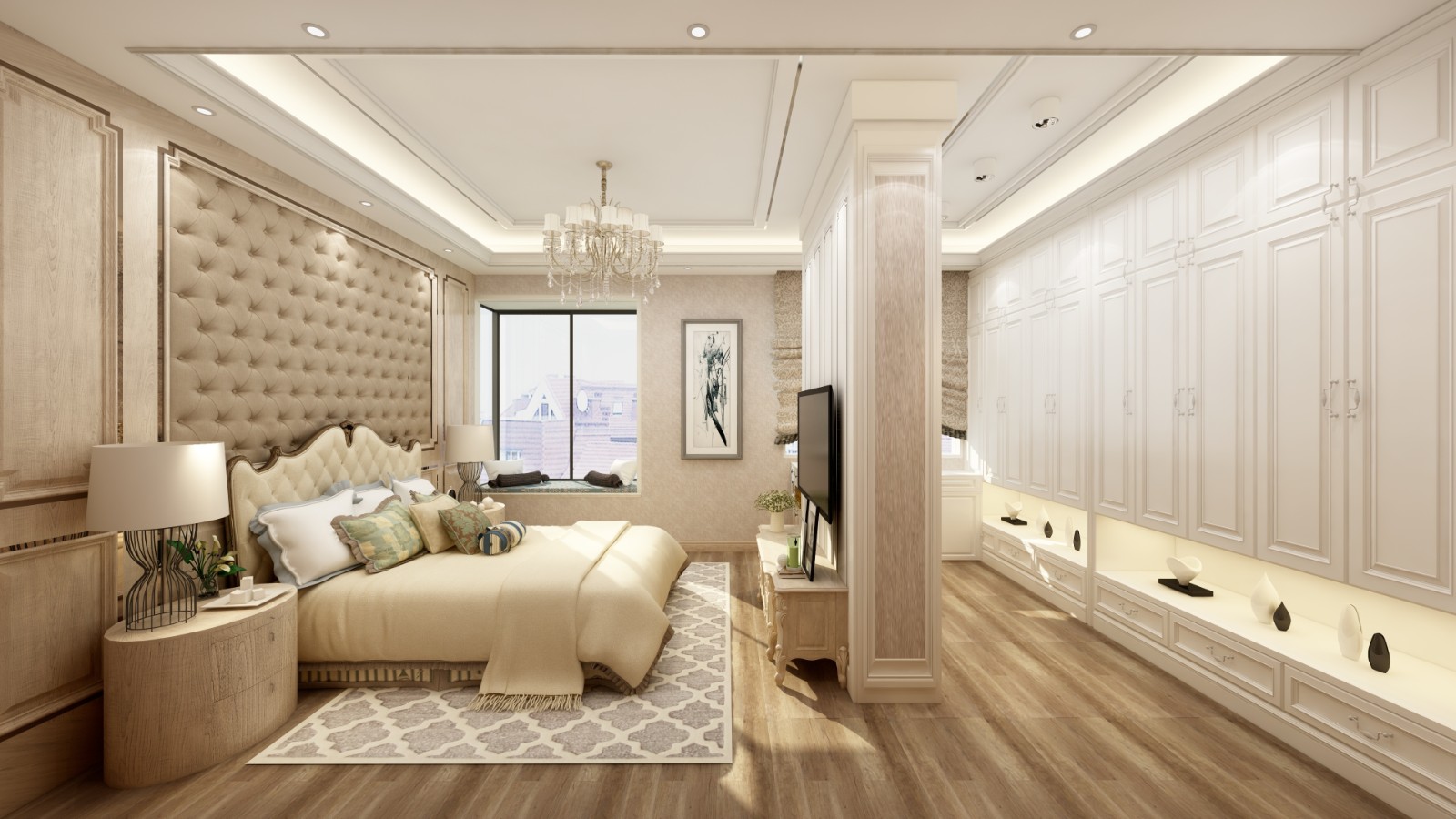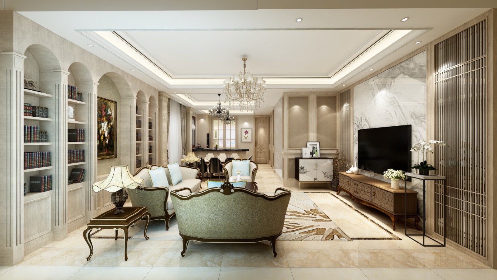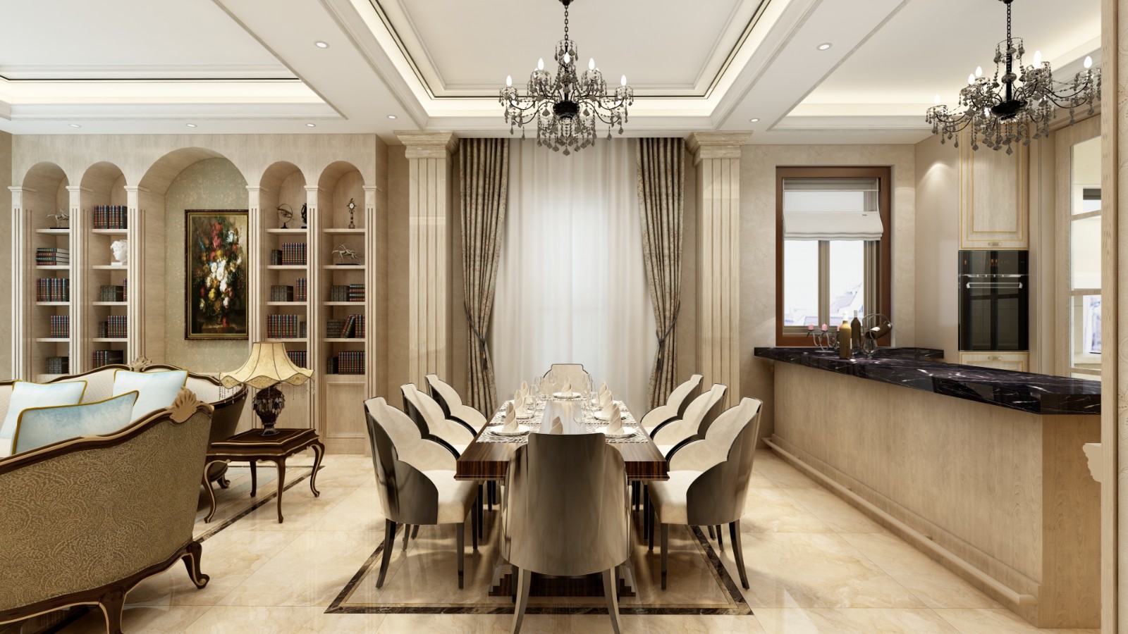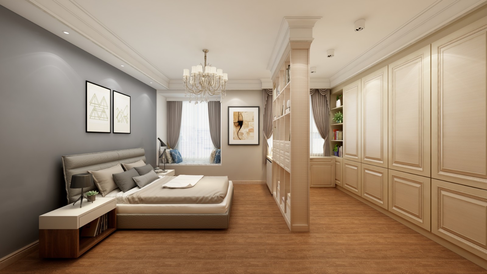 空间最为强大的力量在于整体的统一,在整个设计中所有的方形尖角都进行了四分之一正圆的倒角处理,顶面、墙面、地面三方位立体合一。地面的人字拼地板和白色理石无缝拼接也是与顶面边吊的设计造型相互呼应。
