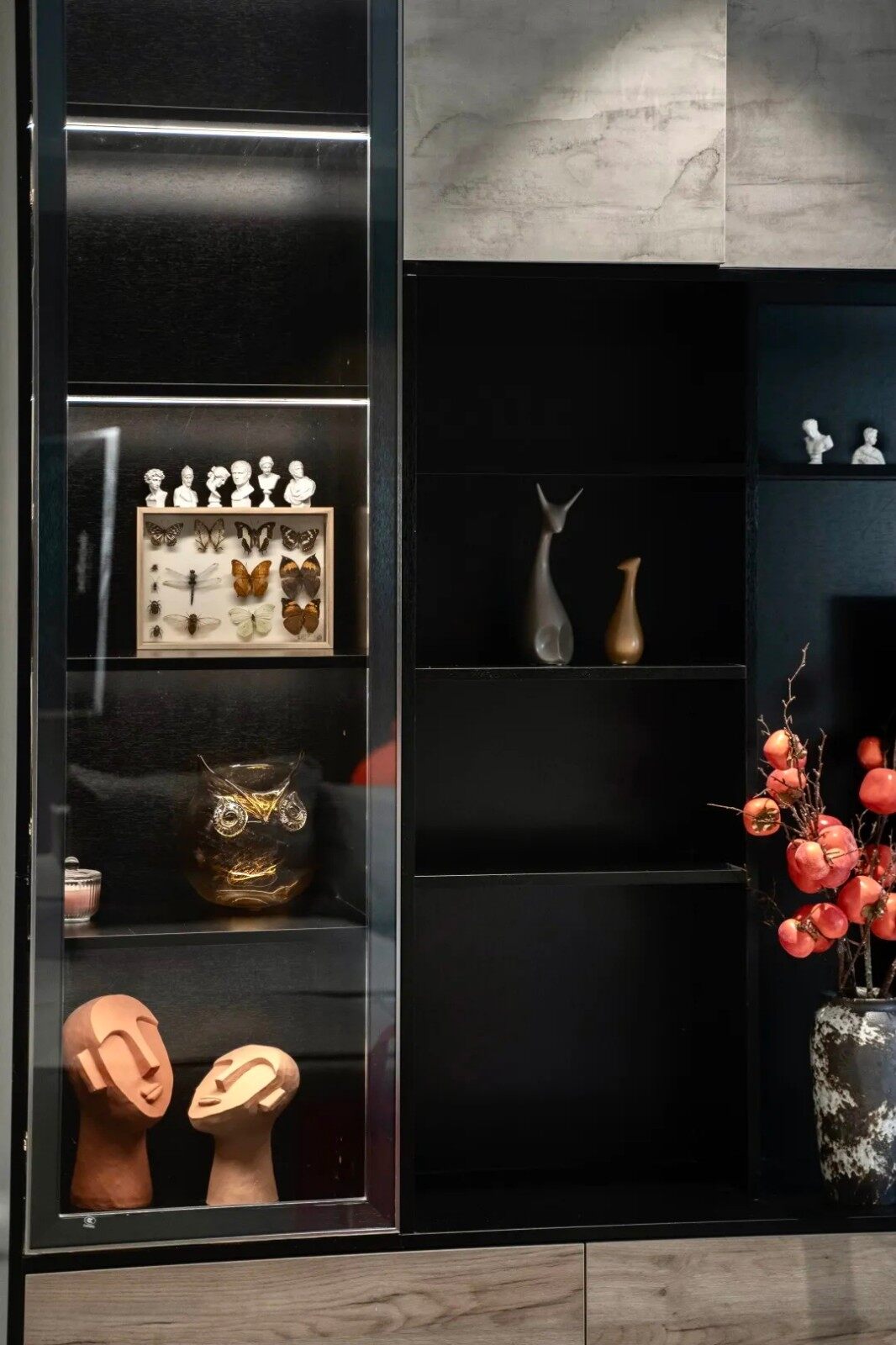 左侧边是透明的展示柜,摆上书籍或者从各路收集来的艺术品,彰显出一种端庄优雅的实用气质。