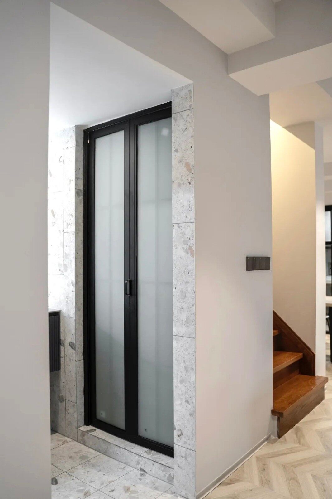 往里边这扇长虹玻璃做的谷仓门别有一番趣味,实则里面是夫妻俩的洗衣房哦。