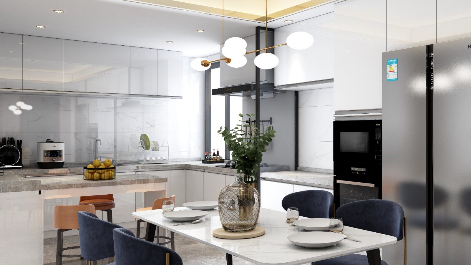 厨房橱柜与墙地砖的材质颜色以白色吊柜以及墙砖为基调,灰白色地面为辅通铺至客厅,尽显年轻活力。