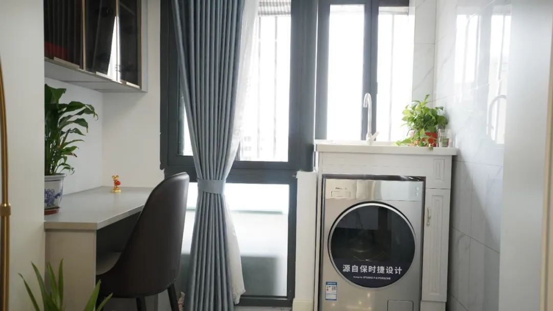 将原有的阳台往外拓宽一部分做晾洗区,阳台空间作为办公区,两者互不干扰。