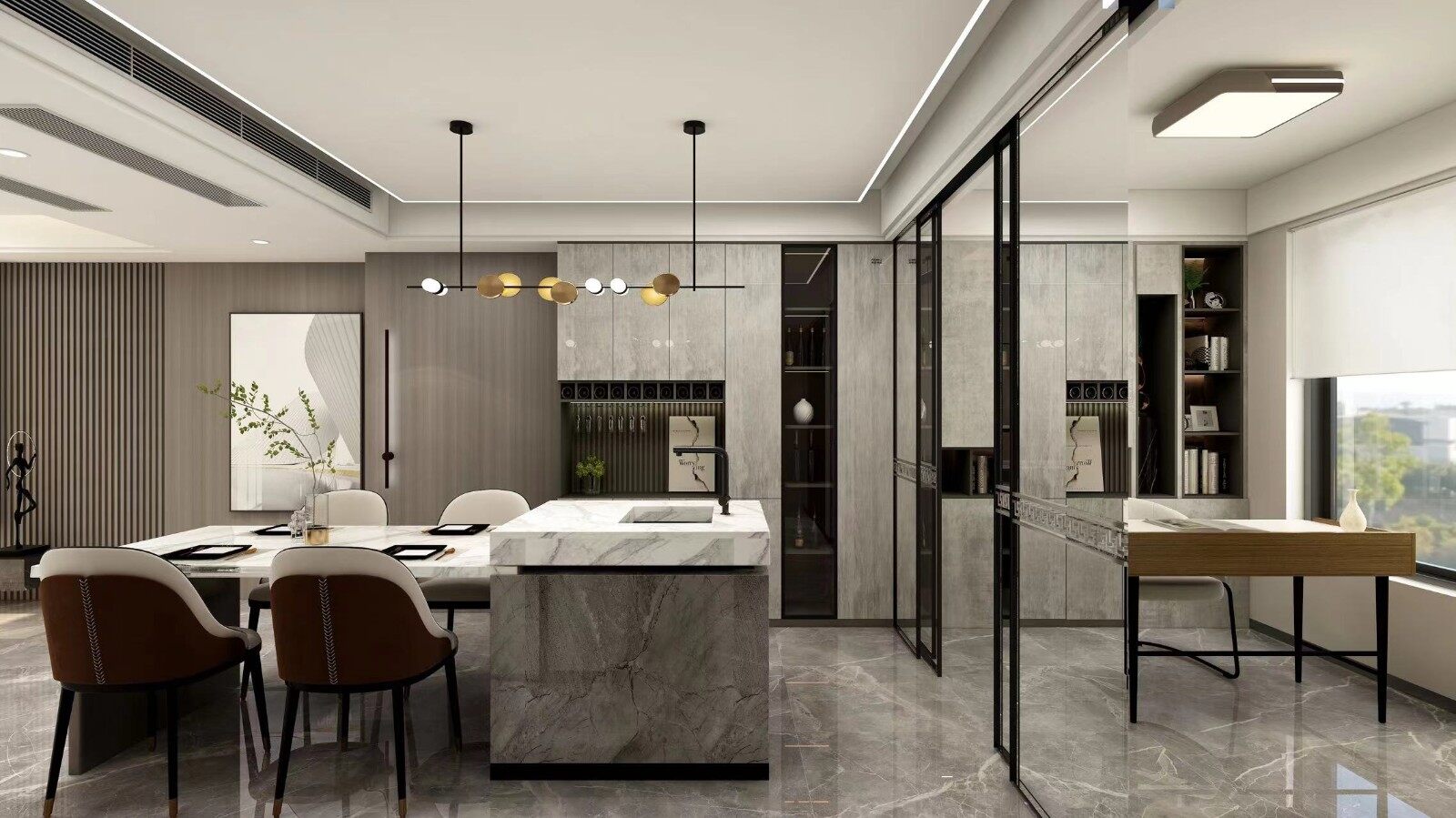 餐厅增加餐边柜,灰色地砖通铺与墙面相呼应,从而更好地提高生活品质。