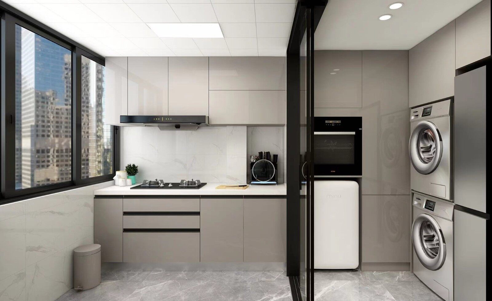厨房橱柜与墙地砖的材质颜色以浅色吊柜以及墙砖为基调,考虑冰箱的位置。增加了洗衣机烘干机以及洗碗机烤箱的功能。