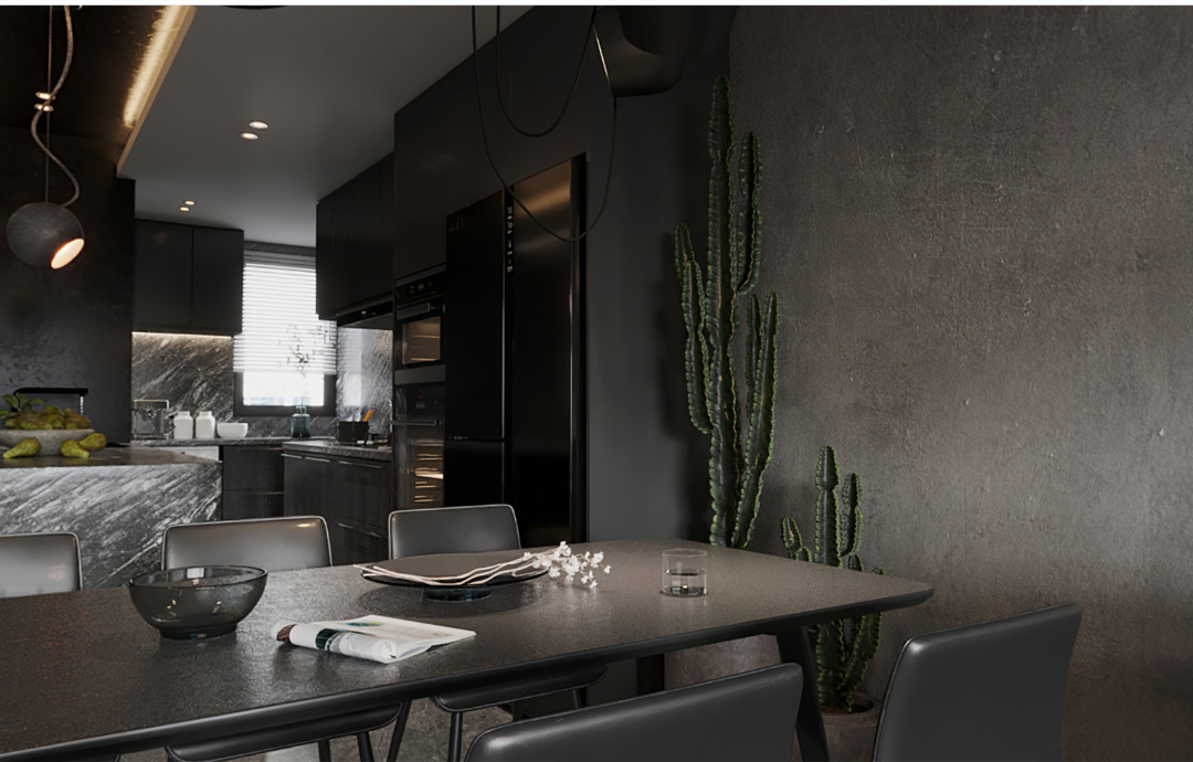 无需繁复华丽的花样与饰具,仅以黑色家居、灰色厨房墙面搭配漆灰地面,即可为你创造一个简约凝练的厨房空间,极简大气又不失现代感。