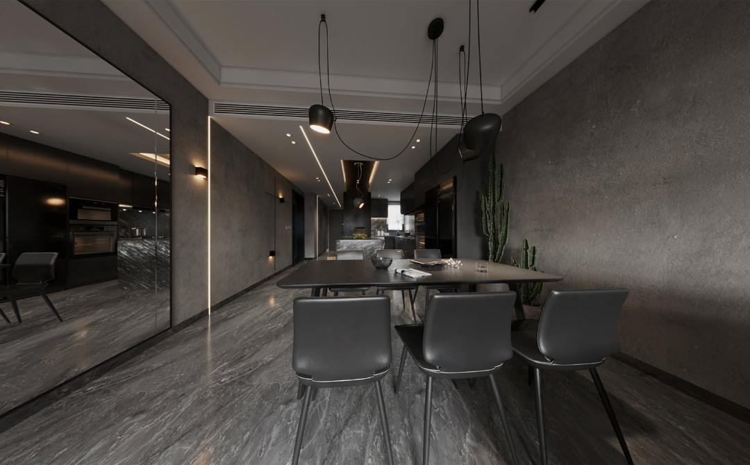 餐厅在配饰上,延续了黑灰的主色调,以简洁的造型营造出时尚前卫的感觉。黑色系餐厅与原木、金属结合,营造出更适宜的就餐氛围。